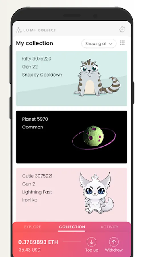 - Collect crypto ERC721 tokens such as CryptoKitties, Blockchain Cuties and 0xUniverse there. We have created beautiful profile cards so you can enjoy your collectibles at 100 percent!