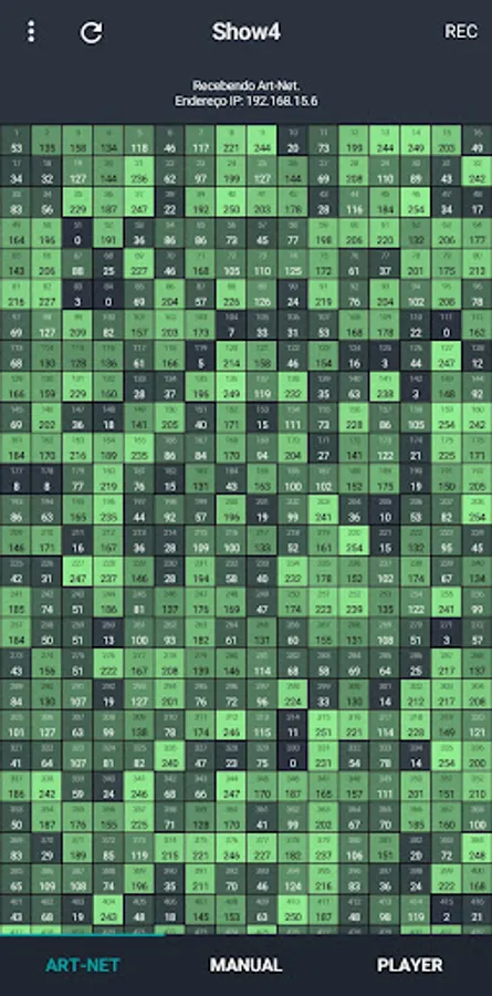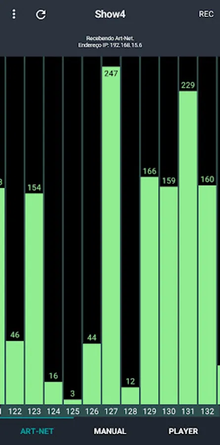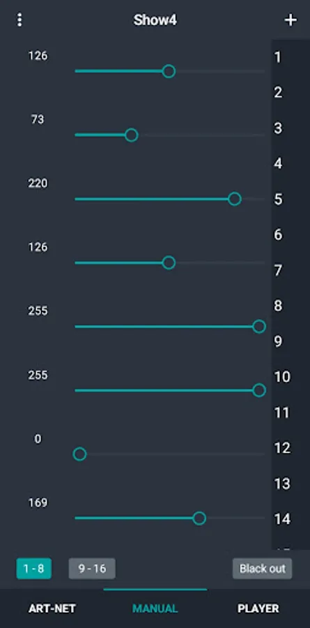 2) Manual mode: shows 8 faders that, together with the pages, allow you to manually change the value of 512 DMX channels, these channels are sent over the network in ArtDmx packets;
