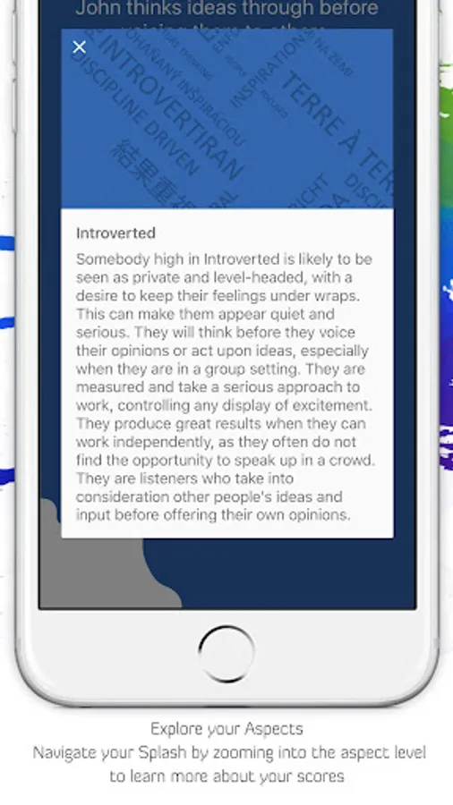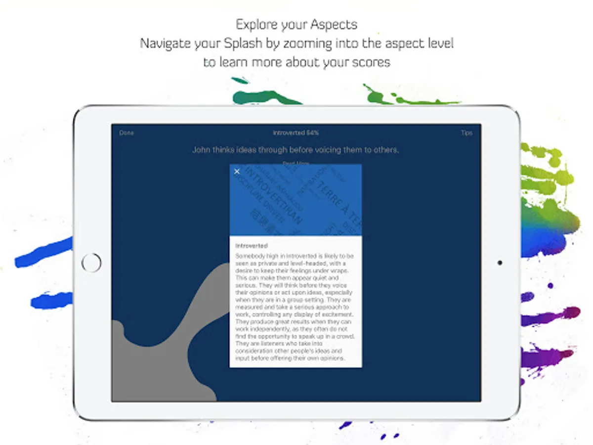 Navigate your Splash by zooming into the aspect level to learn more about your scores with the help of dynamic descriptions which are generated by your responses.