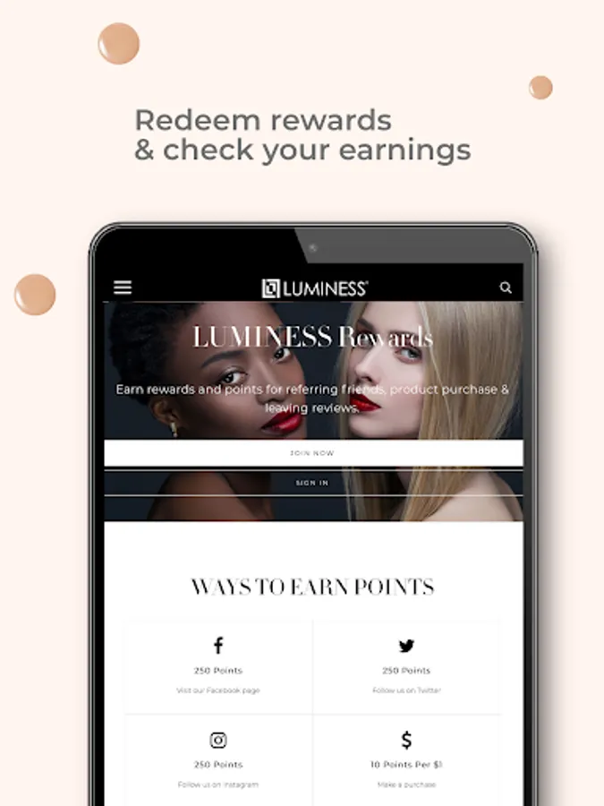 - Access your LUMINESS Rewards account to view current status and points balance.