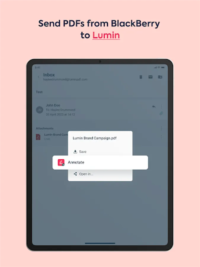 - Seamlessly send your documents as email attachments via BlackBerry® Work
