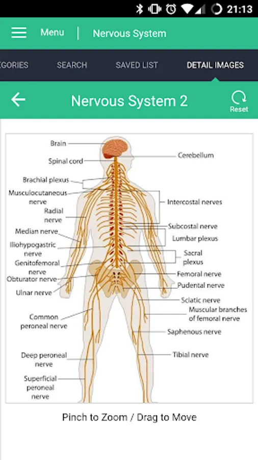 This apps covers information about the Human Nervous system split into 10 top level sections: Central Nervous System, Peripheral Nervous System, Neurons and Nerve Fibers, Termination, Cranial Nerves, Spinal Nerves, Nerves of the Brachial Plexus, Cervical Plexus, Lumbrosacral Plexus and Anatomy of the Autonomic Nervous System