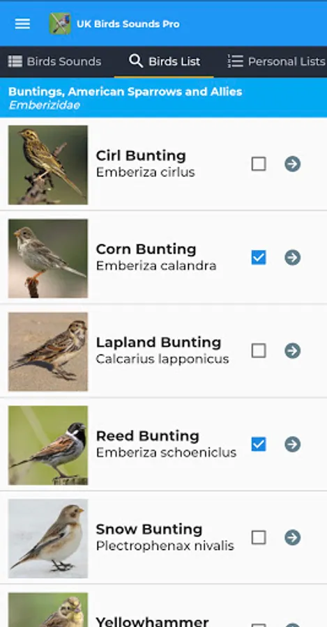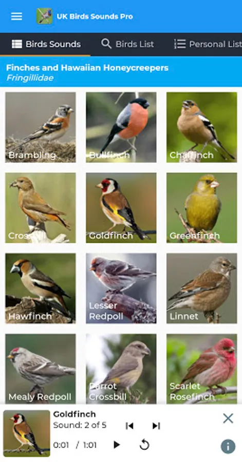 Personal Lists can be created too! Create a list of your favourite birds, or add birds that you've seen on a recent bird watching trip. Birds can be added to your lists from each birds species screens.