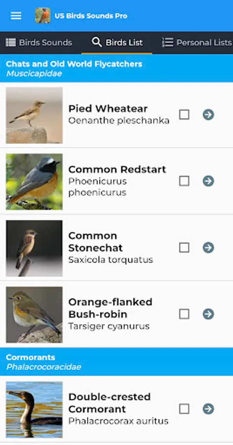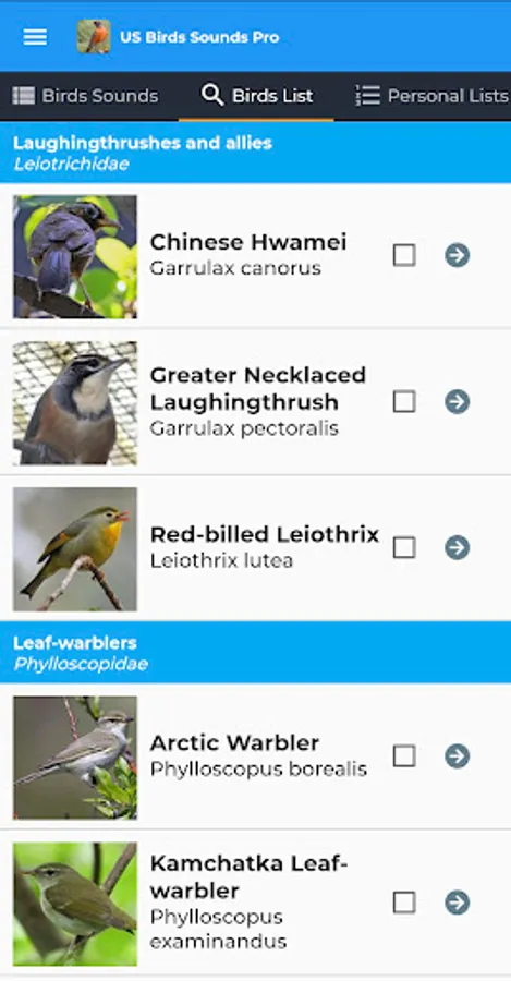 Birds can be grouped by family or alphabetical order, with and without headings, using the Birds Sounds settings.