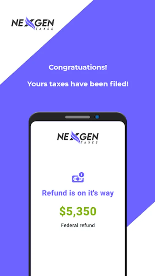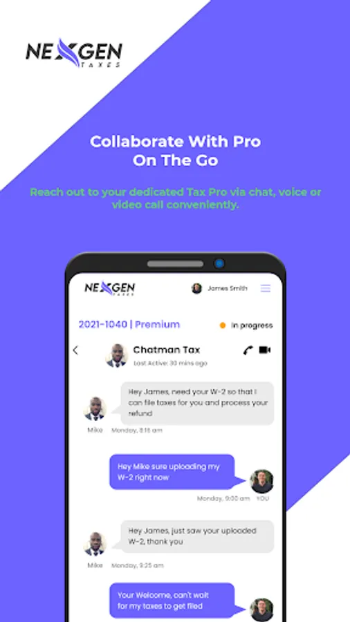 On NexGen Taxes tax app you can confidently share your documents, review your tax filing, sign and e-file your taxes, and make payment to the Pro all within the app knowing that your information is secure. Our app messaging and data sharing are encrypted at rest and in transit.