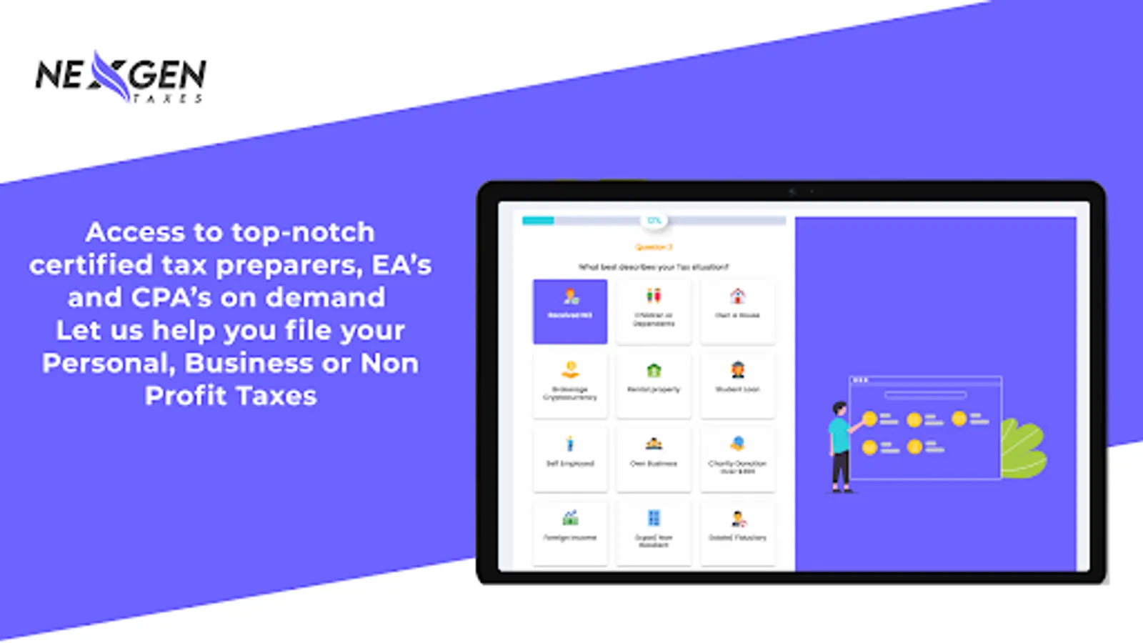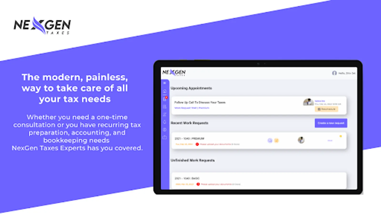 Tired of waiting to get your taxes done and need professional help? Get in touch with a Certified Tax Pro with NexGen Taxes tax filing platform any time of the year. The Pros in NexGen Taxes On-Demand platform can take care of your Personal and Business tax filing, Accounting and Bookkeeping needs.