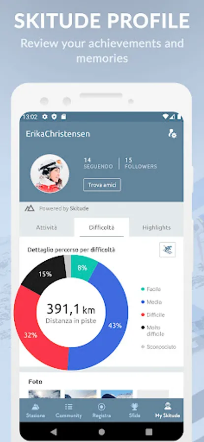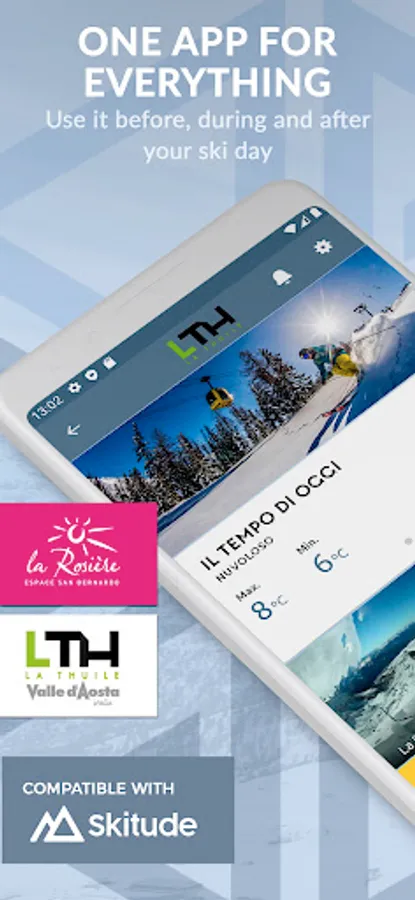 The App offers a range of features designed to optimize your experience before, during and after your trip. Itβs very simple, plan your getaway and get real time updates on slope conditions. Set up your Skitude profile and track your activities on the slopes to get detailed stats about all your activities. And thatβs not all, take part in challenges competing with the whole community, to be in with a chance of winning incredible prizes.