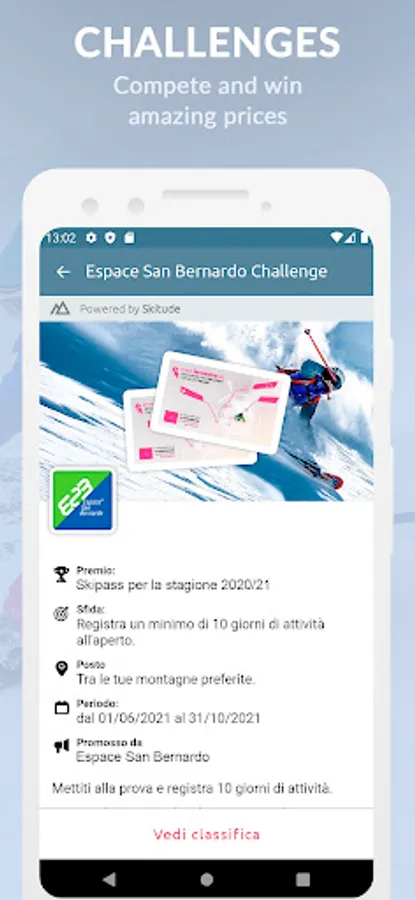 Set up your Skitude profile to track your activities using the GPS tracker. Find out where you are in the season's rankings and try to complete the challenges to be in with a chance of winning great prizes.