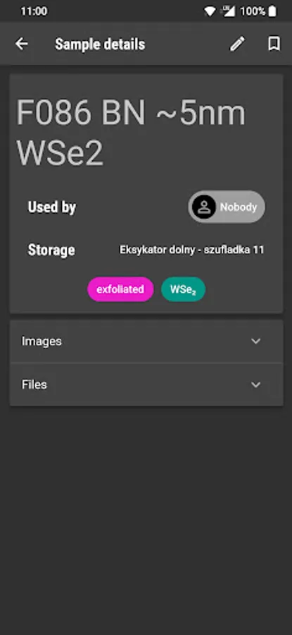 This app allows keeping track of samples used in the lab, so that necessary information regarding their location and basic properties can be easily accessible. Its primary use case is to allow for quick checks where exactly a particular sample can be found using submitted photos and logs of previous owners. It is also possible, however, to attach other pictures like microscope scans, for easier access, while attaching labels enables grouping samples into categories.
