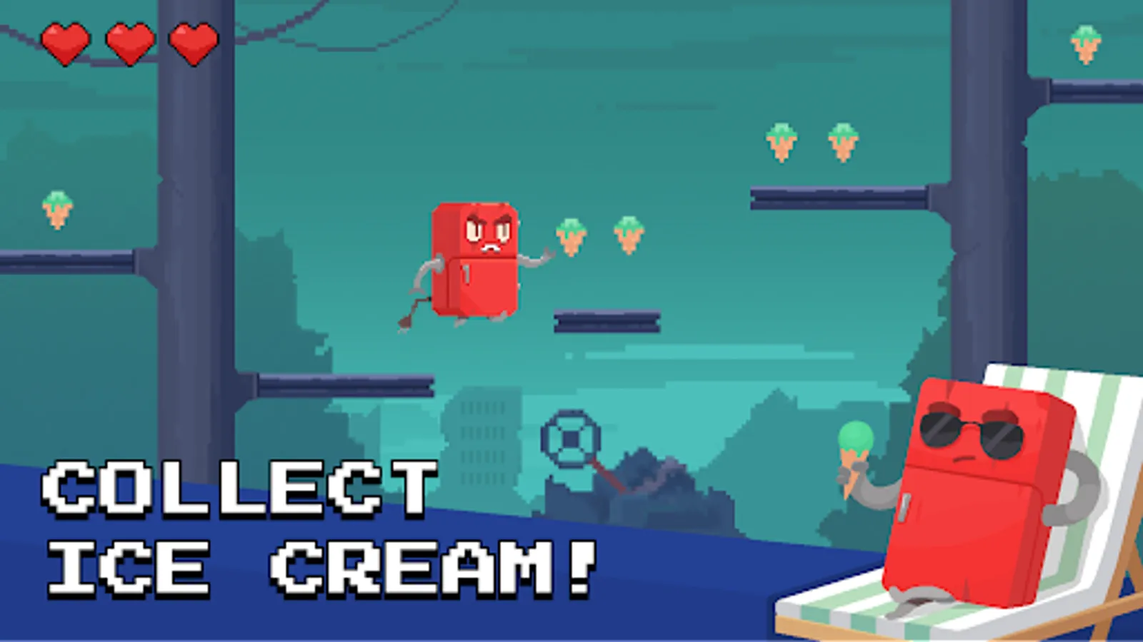 Gather ice creams as you make your way through the levels! Use them to power-up your fridge, unlocking new abilities and features.