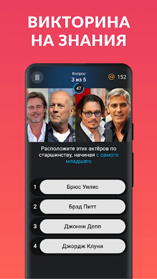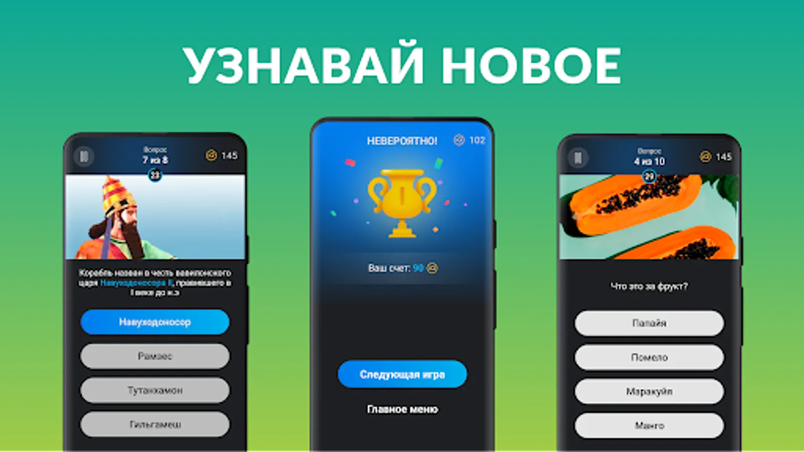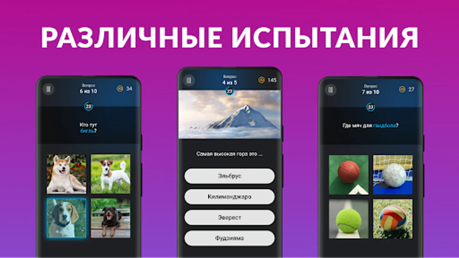 In addition to the classic quiz with questions and four answers, you will also find questions with four pictures and tasks where you need to show your dexterity and ingenuity. These tasks will help broaden your horizons and develop the ability to quickly and accurately find answers.