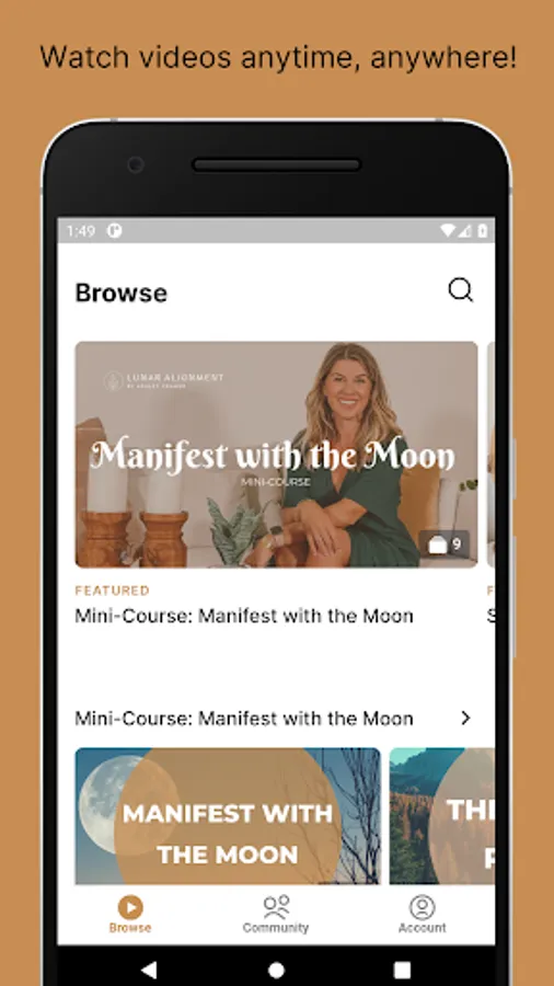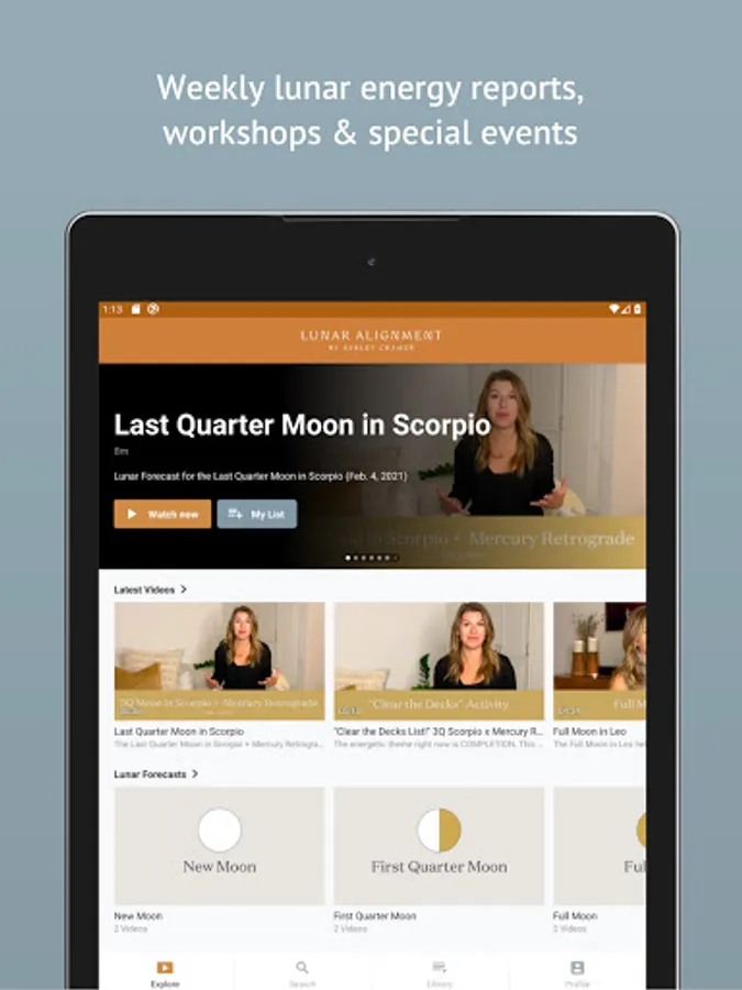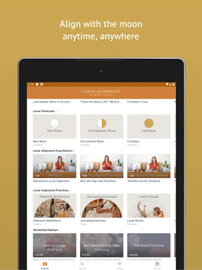 The Lunar Alignment by Ashley Cramer app is the home of the Lunar Alignment Membership and gives you access to videos and downloadable tools to connect with yourself, a community, and something bigger as you align with the phases of the moon.