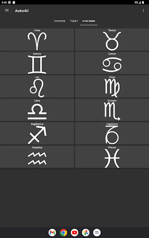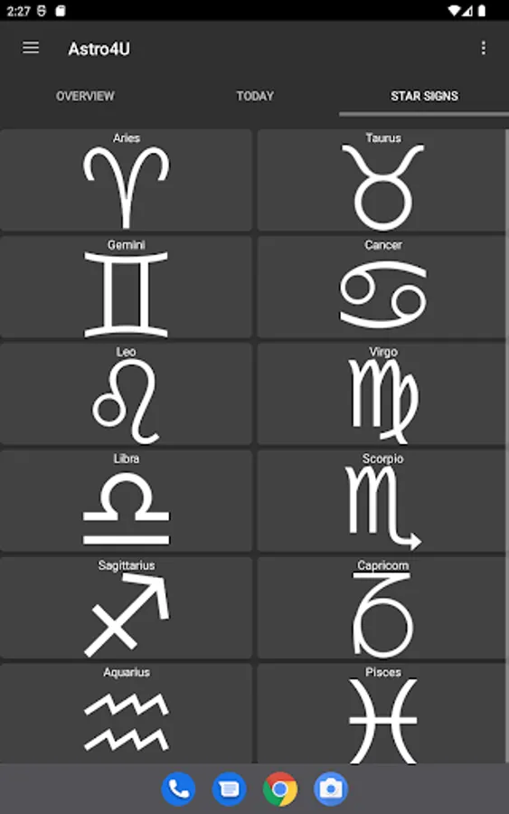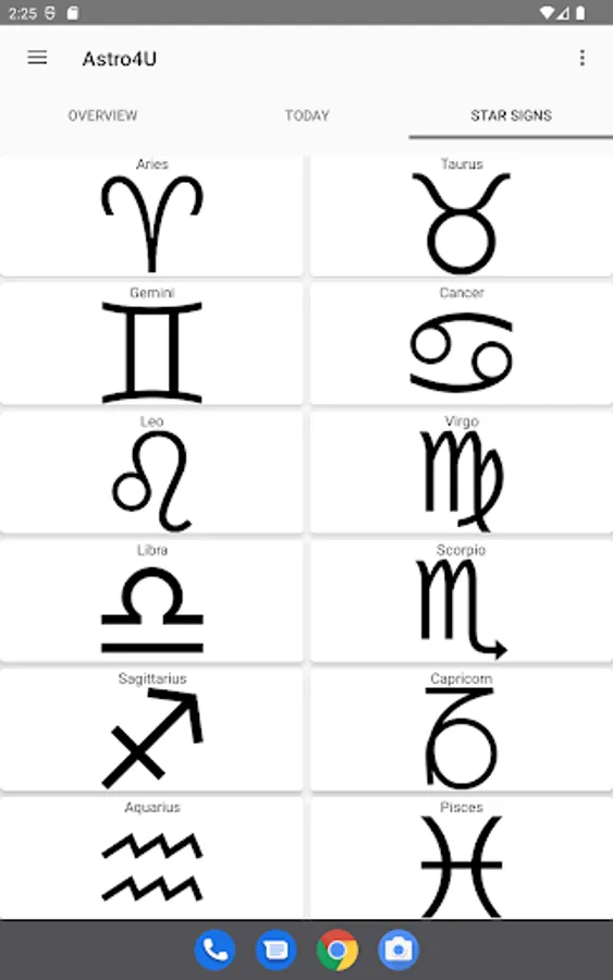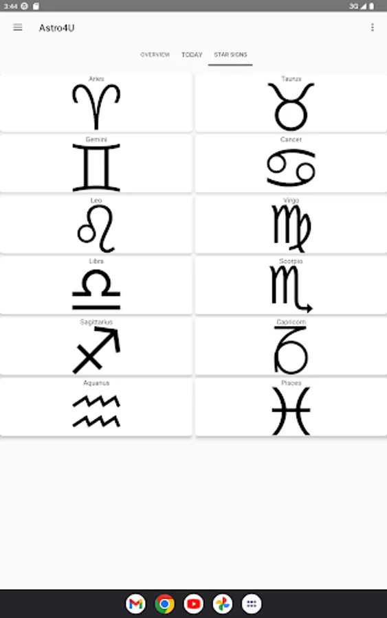 • Display of the zodiac signs and explanatory texts about them.