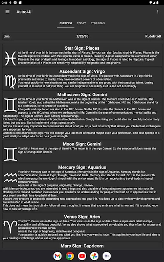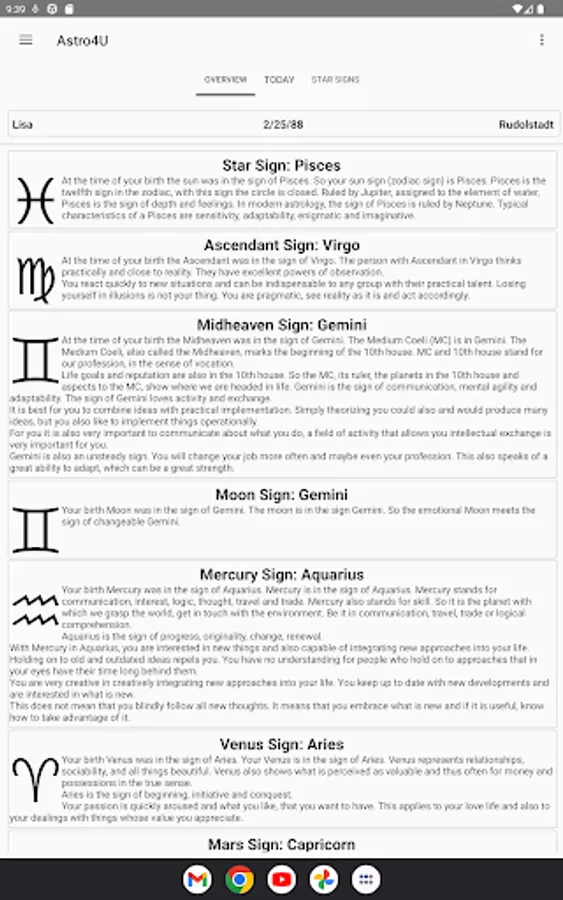 The horoscope app from LunarisApps calculates your personal birth chart with all horoscope factors for free. Besides the zodiac sign also the moon sign, all planets, your ascendant, the midheaven and the astrological houses. A complete horoscope, just like professional astrologers use it.