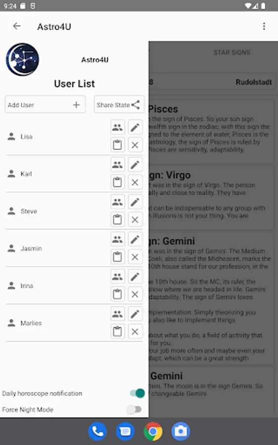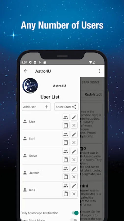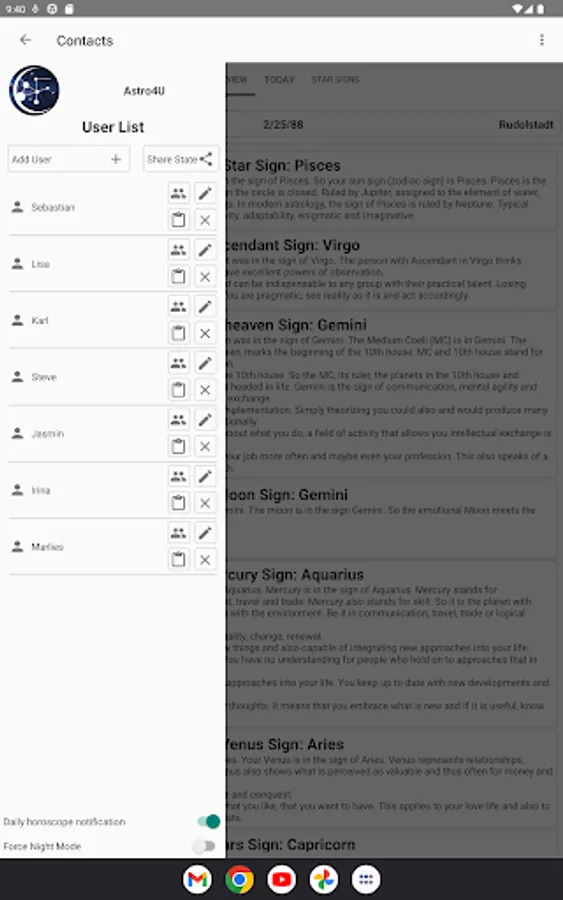 You can calculate the horoscopes of any number of people. The only requirement is to specify the date of birth. We also recommend specifying the place and time of birth. This will make the data more detailed and give you more information about the moon, ascendant and astrological houses. However, the app can also be used without specifying place and time.