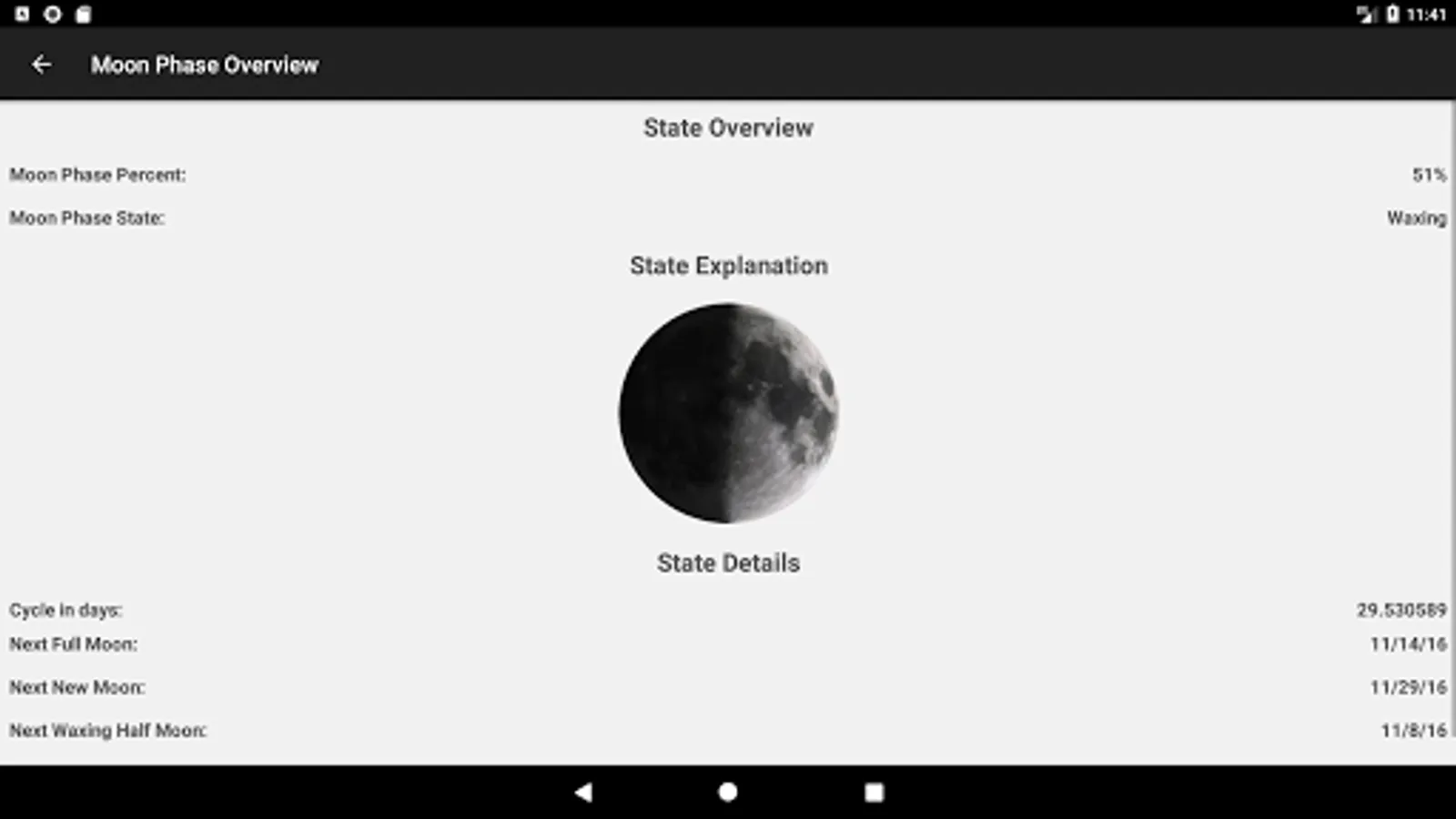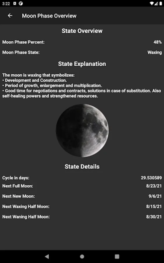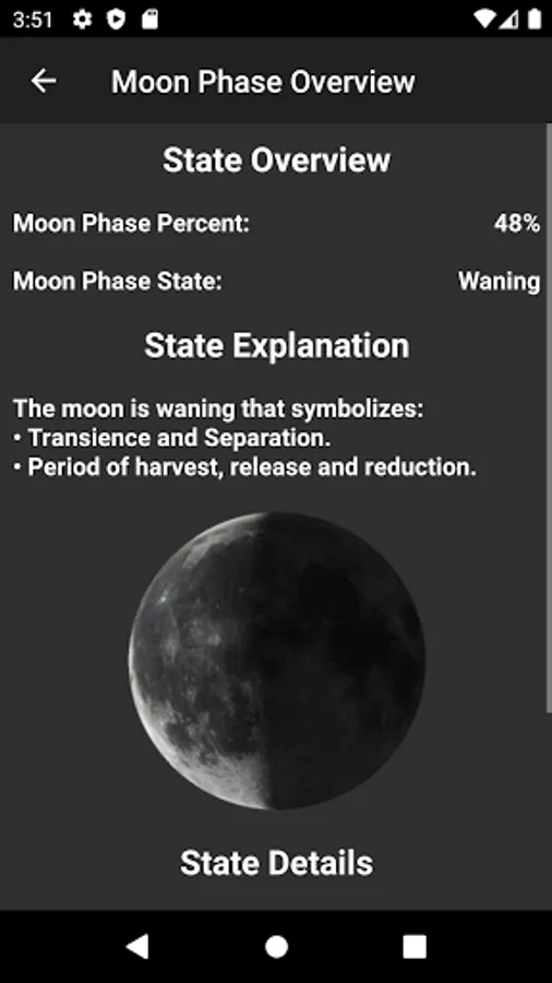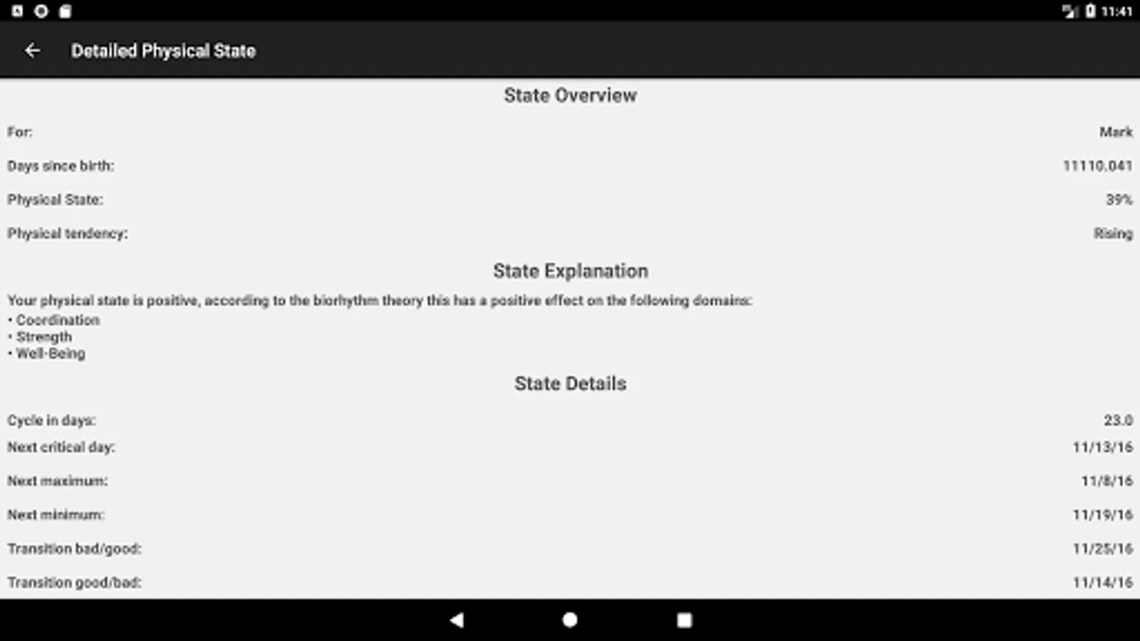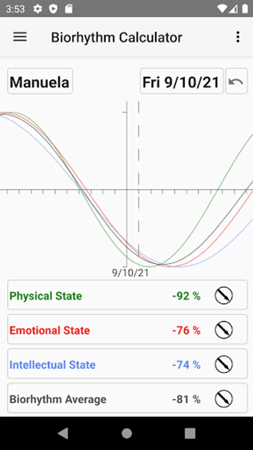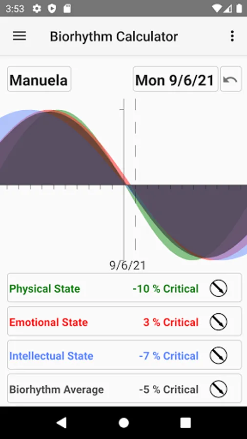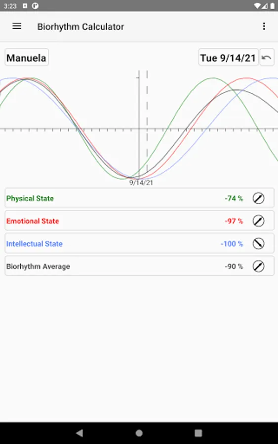 The physical state, the emotional state and the intellectual state are calculated. Furthermore the app allows the calculation of the intuitive state as well as the average over all biorhythms.