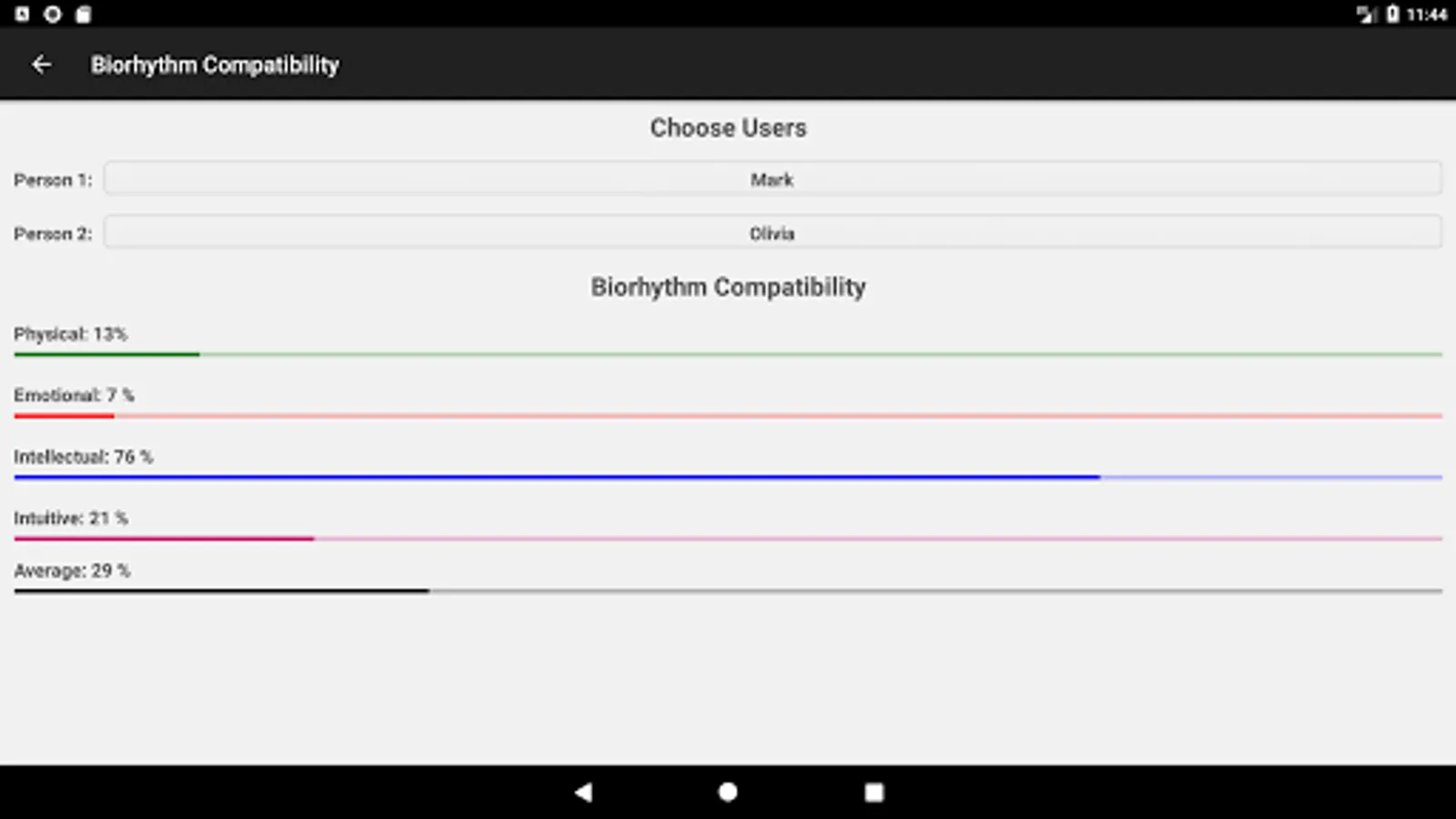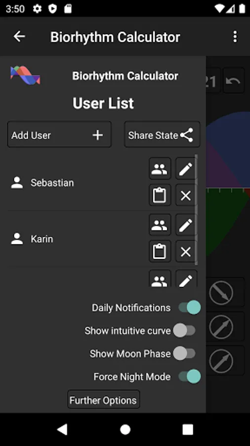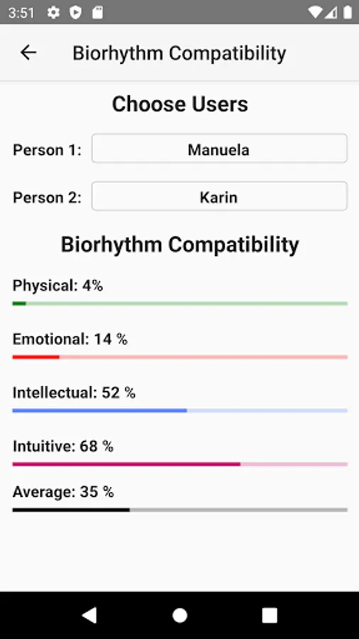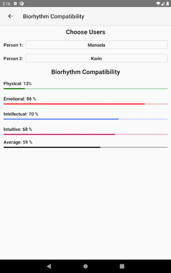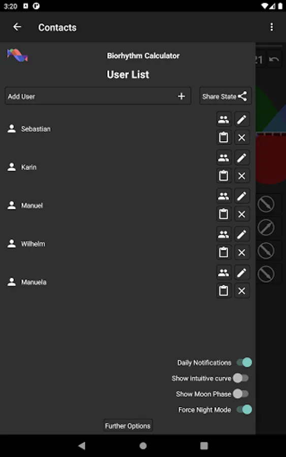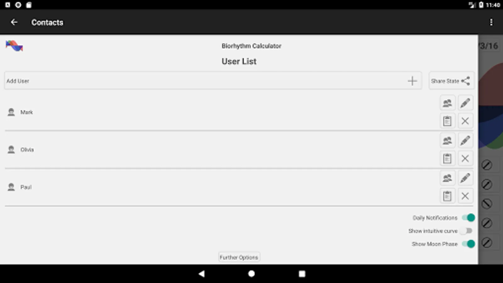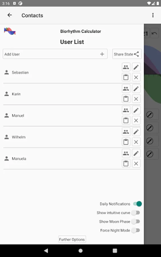 It is also possible to calculate biorhythms for other persons you are able to add as many users as you want. The number off possible contacts is unlimited.