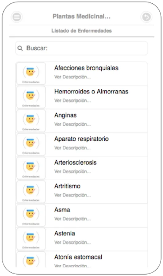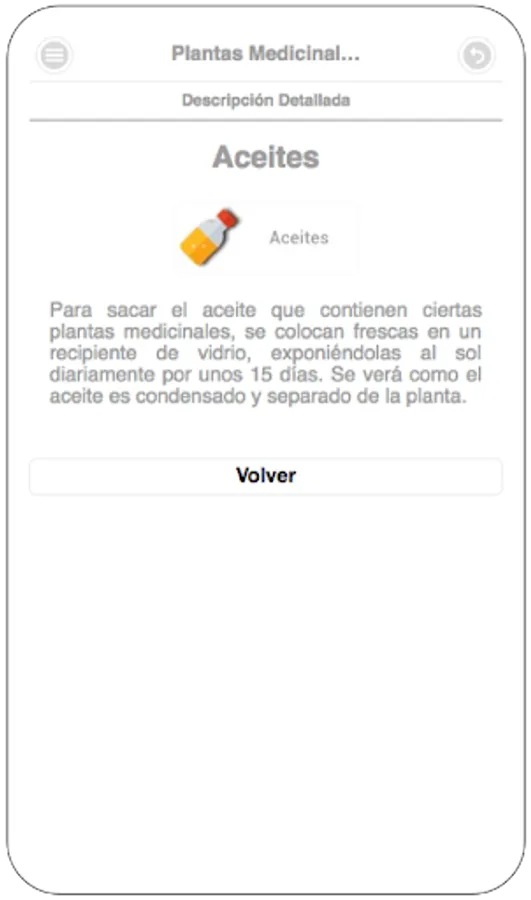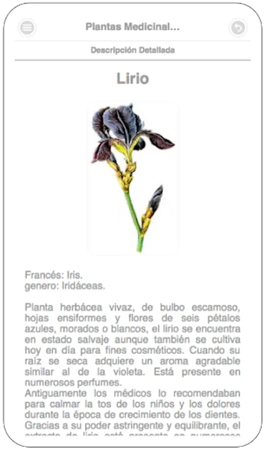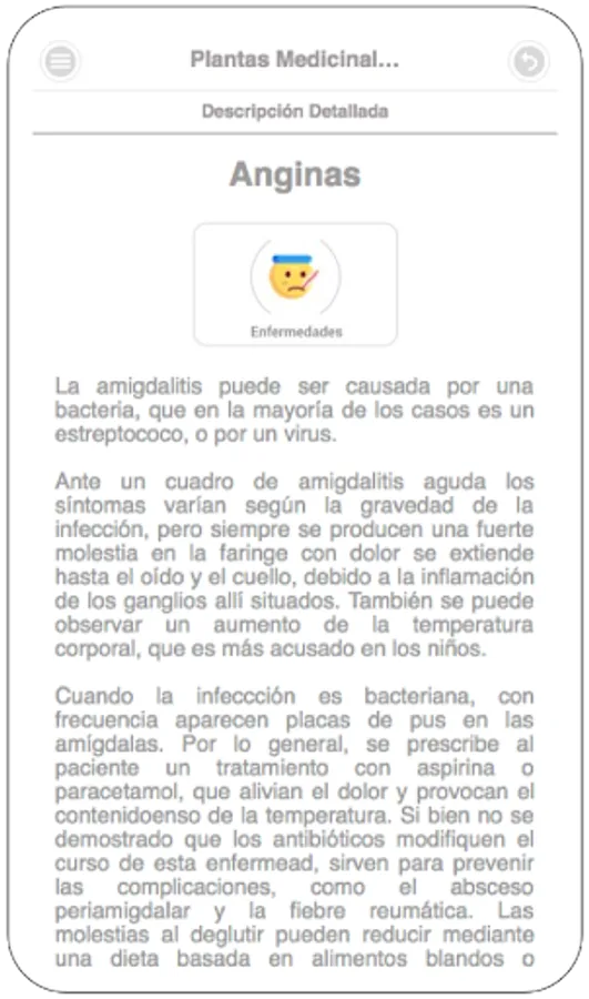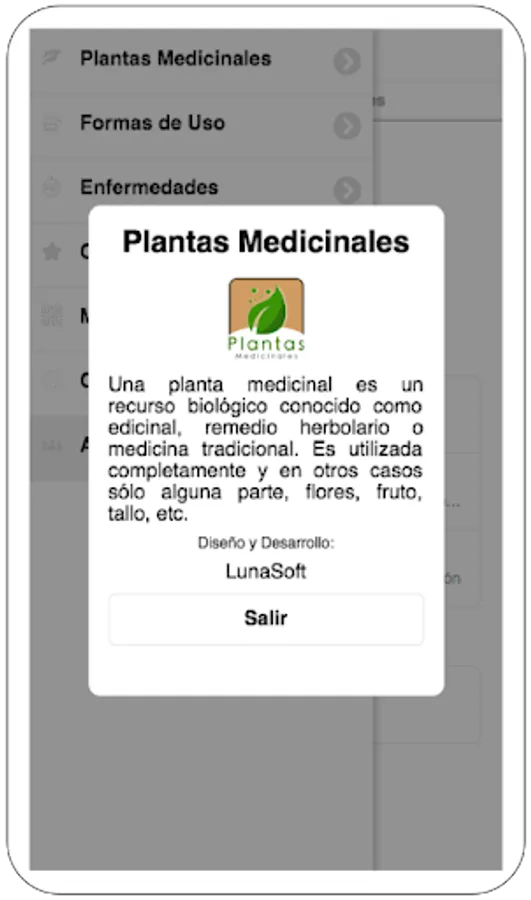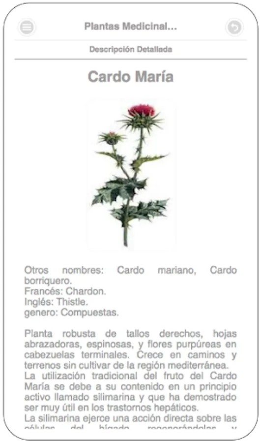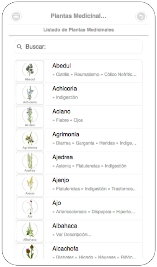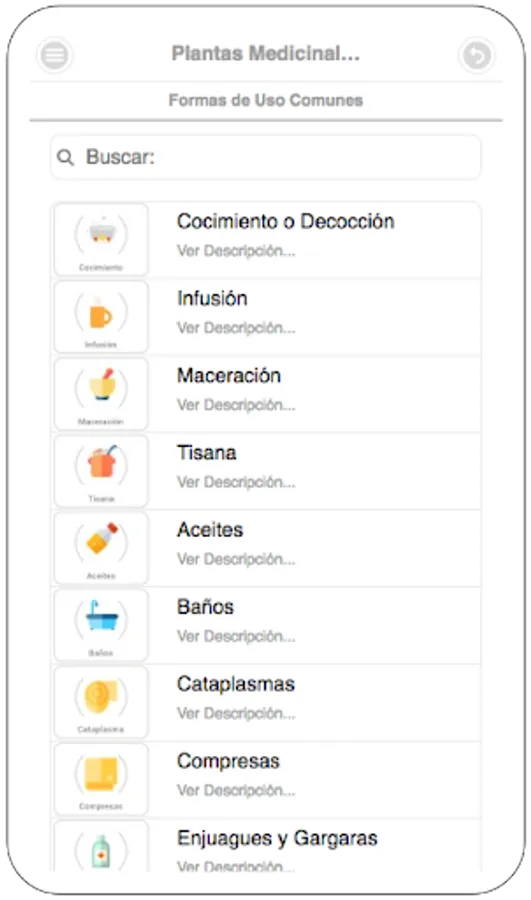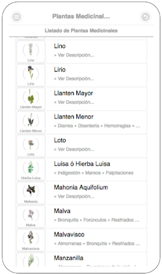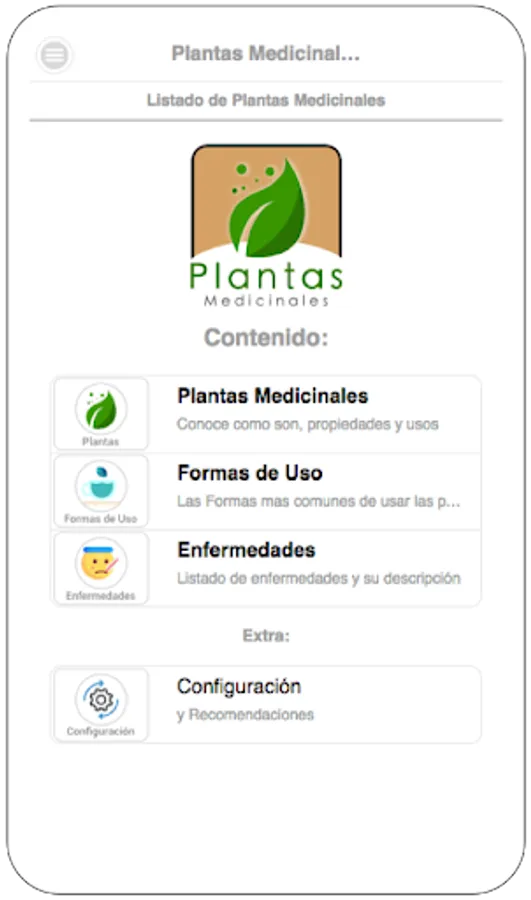 This application shows a list of the best known plants, their uses and the ways in which they are prepared, it also has a brief description of some types of diseases.