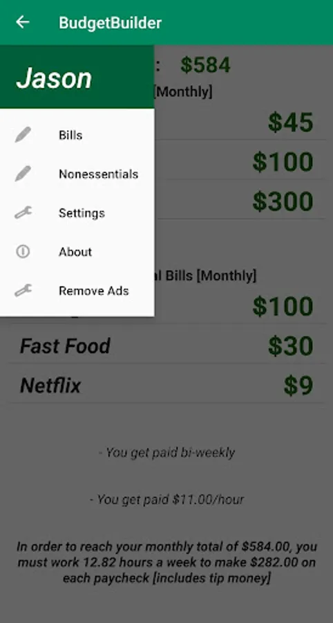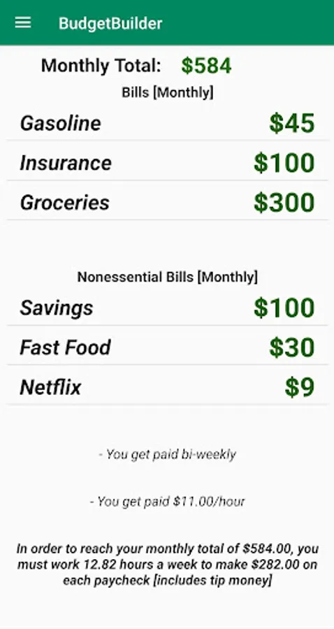 BudgetBuilder's main menu provides helpful information such as how many hours the user will need to work in order to meet their monthly total, or if paid by salary then how much money is needed or leftover after the monthly total is applied to the monthly budget.