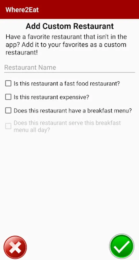 Have a favorite restaurant that's not in the app? Where2Eat has an "Add a Custom Restaurant" feature where you can add any restaurant to the app!