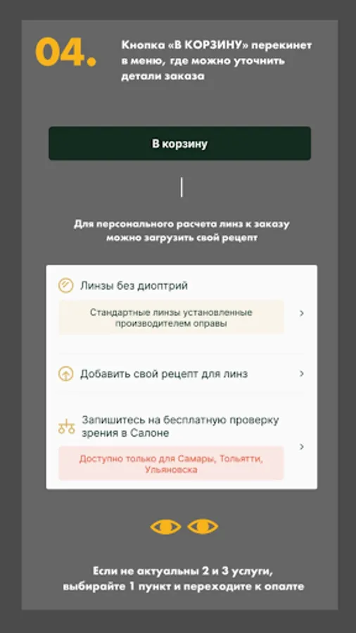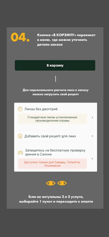 Glasses with lenses for correcting, treating vision, frames of various stylish designs are presented in this mobile application. According to the search criteria, users will be able to find suitable optical accessories for improving and training visual performance. Or choose glasses with lenses of zero indicators or depending on the vision.