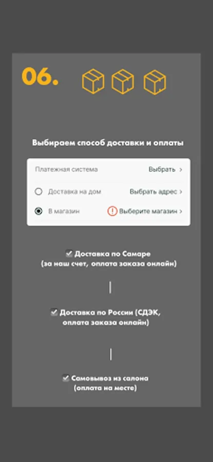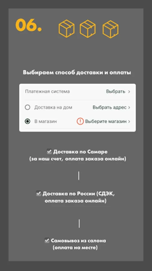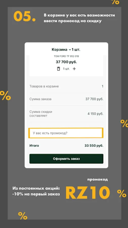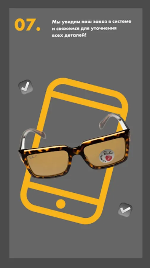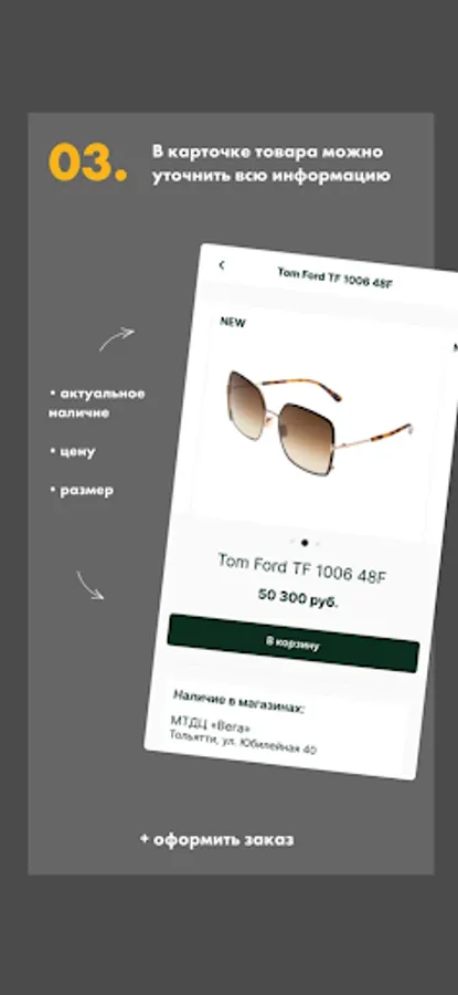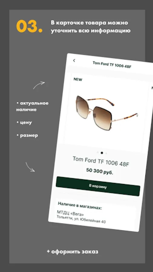 Using the mobile application, you can find the nearest store from the luxury vision chain of optics salons. In the application, you can specify several addresses and quickly calculate the time and cost of delivery by CDEK throughout Russia and the CIS, track the status of your order and not miss getting your favorite model! The selected purchase is made through the personal account of the installed mobile product. A full-fledged technical functionality is incorporated in the proposed software product.