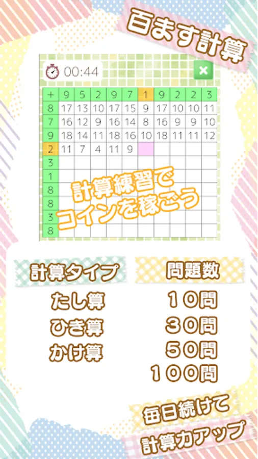 ■ □ ■ Hundred-mass calculation can be easily challenged in the free time with 10 questions, 30 questions, 50 questions, and 100 questions that can be selected from 3 calculation methods of addition, subtraction, and multiplication.