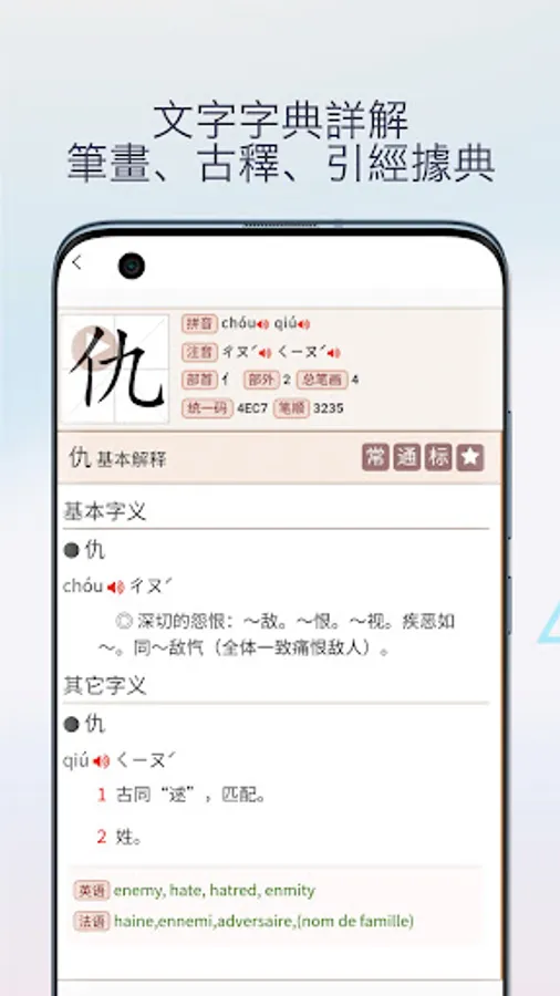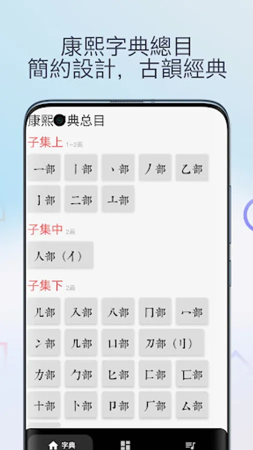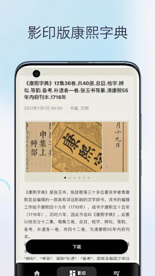 Kangxi Ancient Chinese Dictionary APP is not only a convenient and fast word search tool, but also a treasure trove of knowledge that brings together rich ancient Chinese character culture. The following are the core functions of the application: Kangxi Dictionary General Catalog: It has the complete catalog of Kangxi Dictionary, presented in a simple and classic design, ensuring that you can quickly find the information you need. Collection of 47,000+ ancient Chinese characters: Full coverage of more than 47,000 traditional ancient Chinese characters. Whether you are in academic research or personal interests, you can find detailed word information. Detailed explanation of the word dictionary: Each word is equipped with a detailed explanation, including strokes, ancient interpretations, and quotations from scriptures, etc., providing a comprehensive interpretation of the word. Photocopy version of the Kangxi Dictionary: The app has a built-in photocopy version of the Kangxi Dictionary, which is convenient for you to compare and refer to the original content. Classic ancient books: In addition to the Kangxi Dictionary, a series of electronic versions of classic ancient books are also provided, allowing you to have a deeper understanding and study of ancient Chinese character culture. Kangxi Ancient Chinese Dictionary APP is an essential tool for every Chinese culture enthusiast, scholar and researcher. Download now to start your journey of learning ancient Chinese characters!