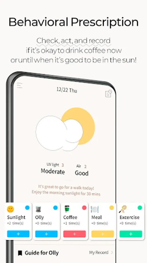 - After recording the sleep diary, we inform you the weather. Check today’s sunlight and refer it to your daily plan.