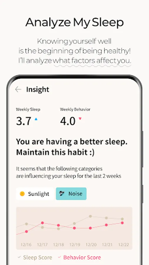 - We offer tips related to sunlight, diet, exercise and caffeine depending on your life style and sleep problem. It helps you find and improve the relation with your sleep by recording behavioral factors that affect your sleep cycle.