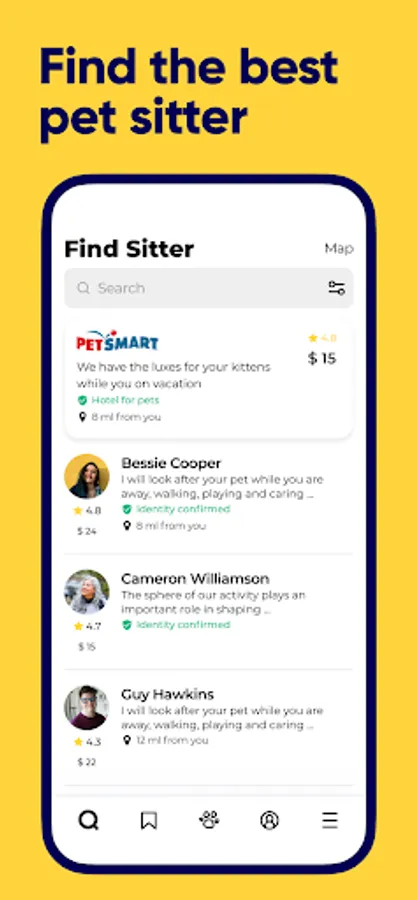 - Pet status "needs a sitter" with dates and times