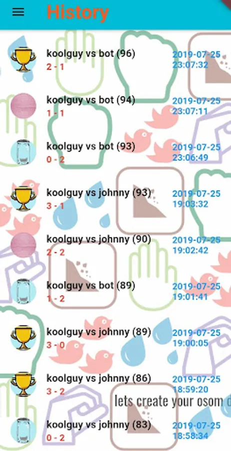 Decide something with OSOM game, a classic rock, paper, scissor game. Malaysian version with bird (burung), rock (batu) and water (air), can be played with bot (single player) or a friend (two player). Now you can still settle some score a classic way with your away comrades. History and leader board are supported to keep track on your performance.