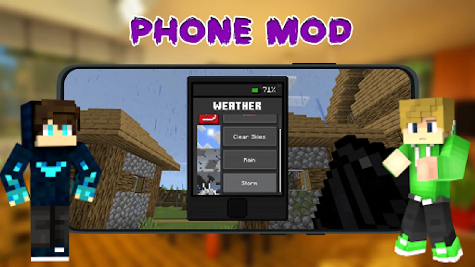 Phone addon has a lot of cool features. First of all, you can find a day and night application where you can change the time of day in the Working Phone Mod for Minecraft PE (pocket edition). Do you want to be the sovereign of the weather in MCPE? Then you need to find a weather app and try to change weather from sunny to rainy or even stormy. We also added an app to the Working Phone Mod for MCPE that will allow you to turn music on and off at any time.