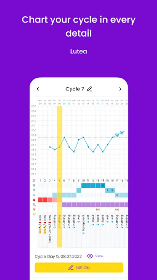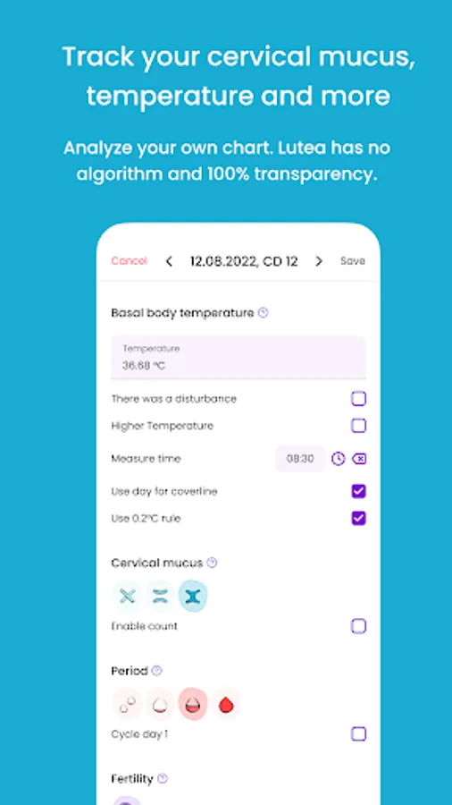 Lutea allows you to track your cervical mucus and basal body temperature while giving you full control of your interpretations with our free charting features such as: