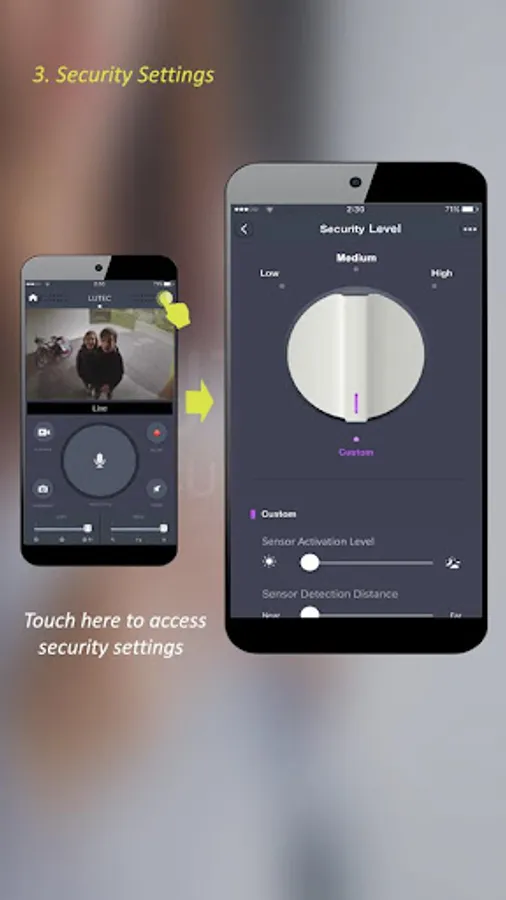 The APP allows you to choose from three, adjustable, predefined presets: LOW, MIDDLE & HIGH security, you can also set the app to CUSTOM level, allowing you to fully control your light or lights. This includes adjusting the PIR sensor detection range, brightness (LUX level) time on duration, time off etc.