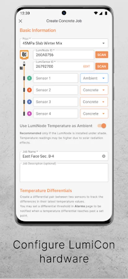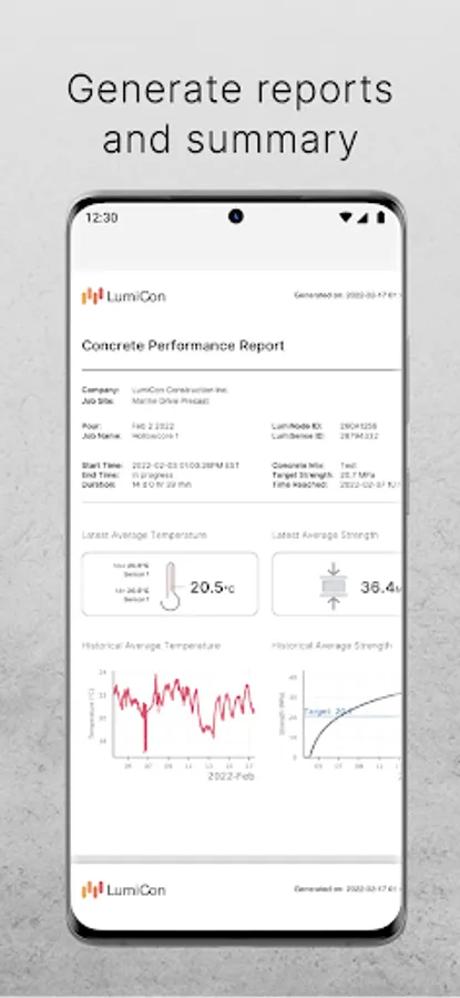 LumiCon is a full-stack IoT solution for continuous and real-time monitoring of concrete. The LumiCon product includes sensor hardware, connectivity, and a cloud-based platform to easily access data from anywhere at anytime. The sensor hardware consists of distributed sensor cables which can be extended to hundreds of meters with the option to customize the number of sensors on each cable. The sensor cables come with ruggedized packaging and can be easily secured to rebar prior to the pouring of the concrete. Once installed, the information from the cables can be easily accessed through the LumiCon mobile app.