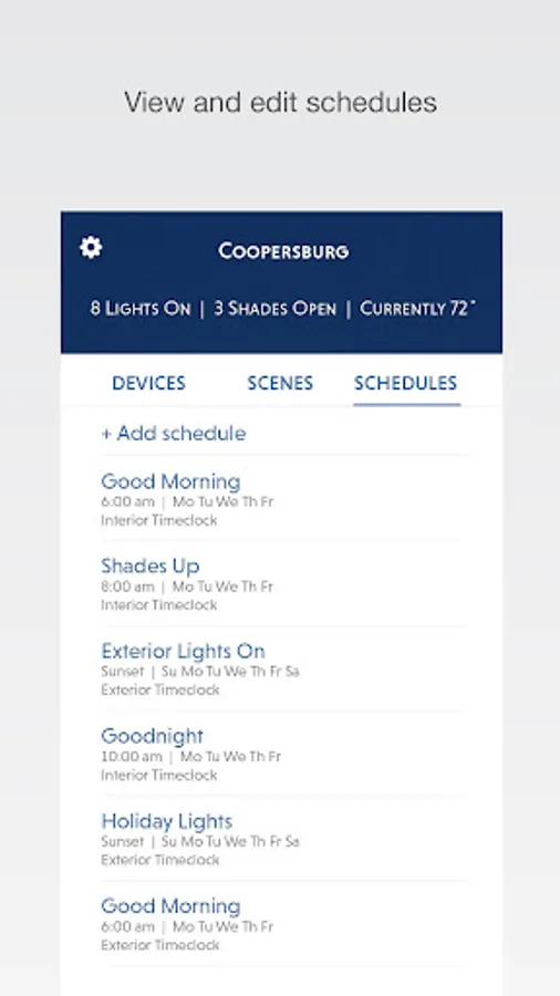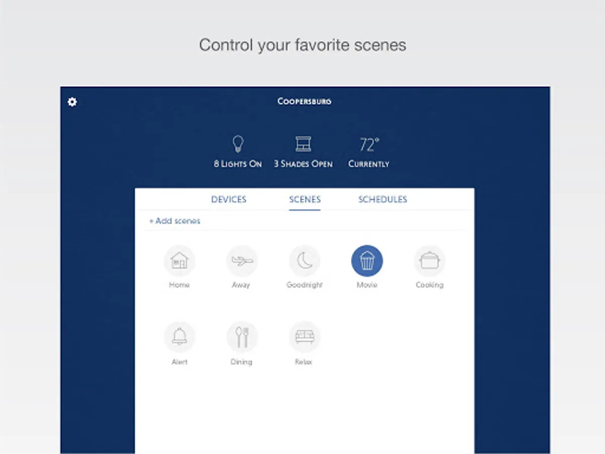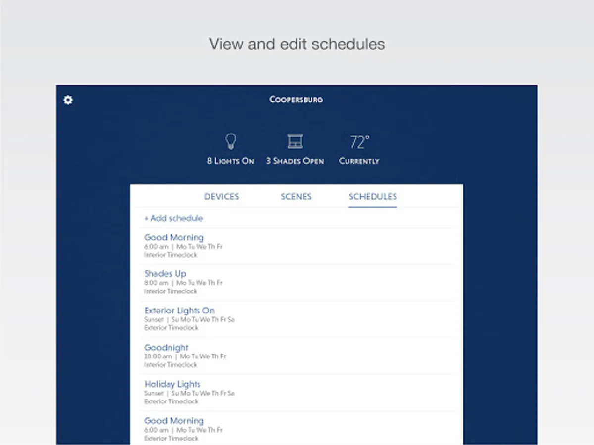 Schedule scenes to happen automatically at set times of day, or based on sunrise and sunset. Turn on your porch light at dusk, turn it off at dawn, or open your shades in the morning to wake up with the sun.