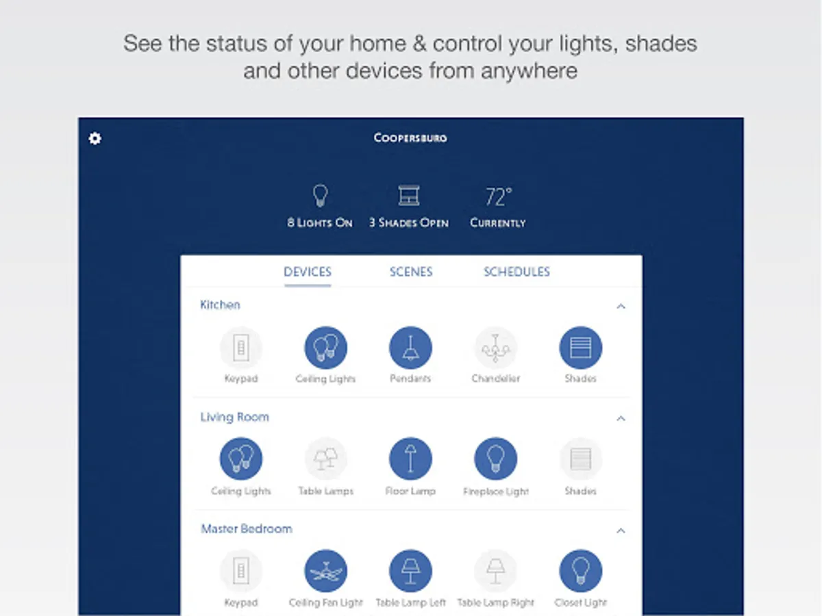 Control lights, shades, temperature, keypads, and more in the comfort of your home or from anywhere in the world – the office, the airport, the beach – set your home to a comfortable temperature when returning from a trip, ensure lights aren't left on and shades aren't left open while you're away.