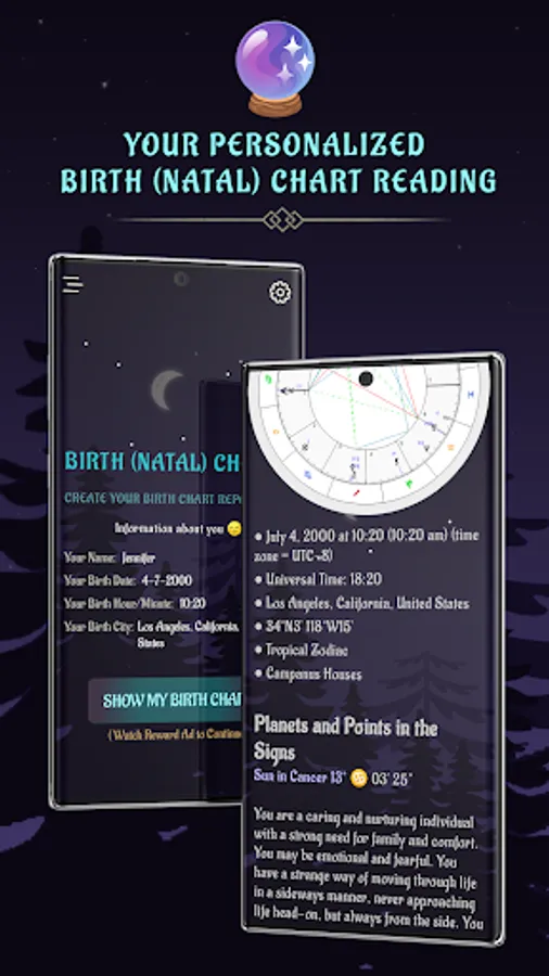 - Get your very unique Natal chart (birth chart) that is an astronomical snapshot of the stars based on the exact day, time, and place you were born.