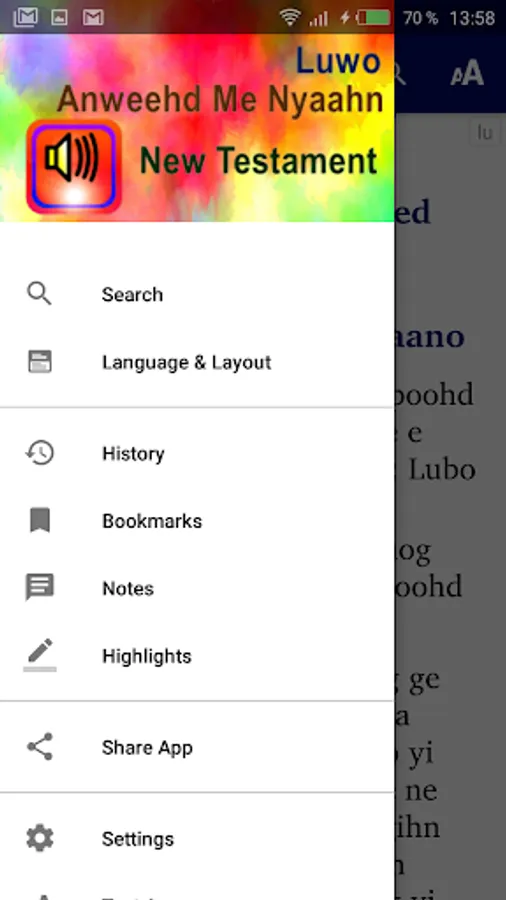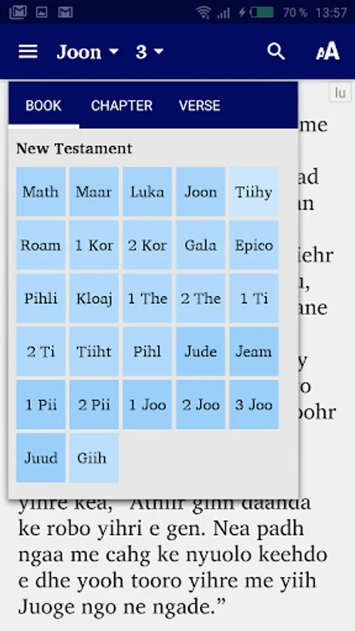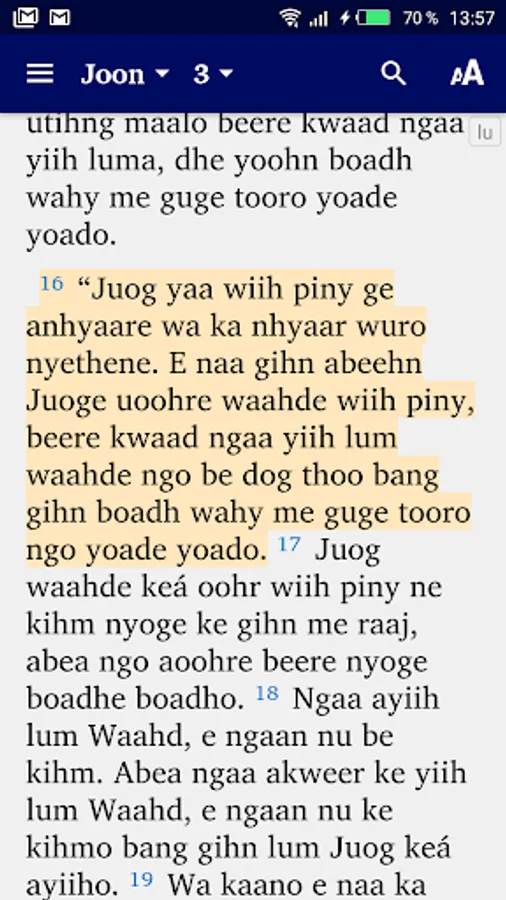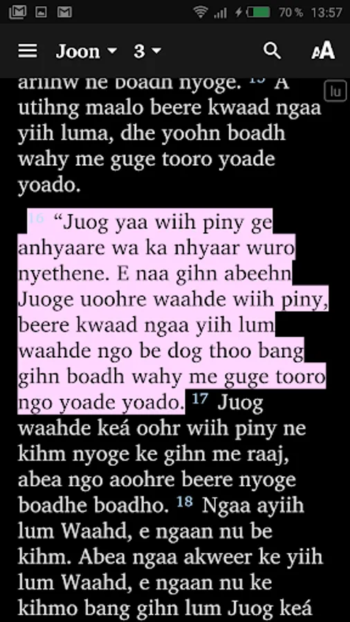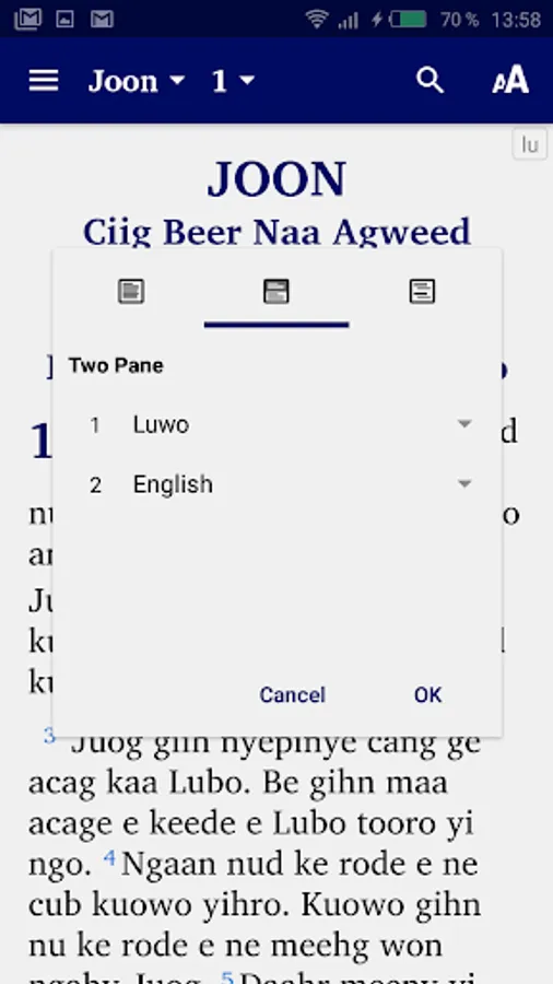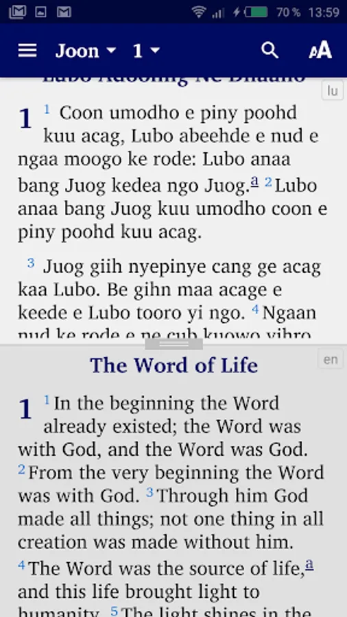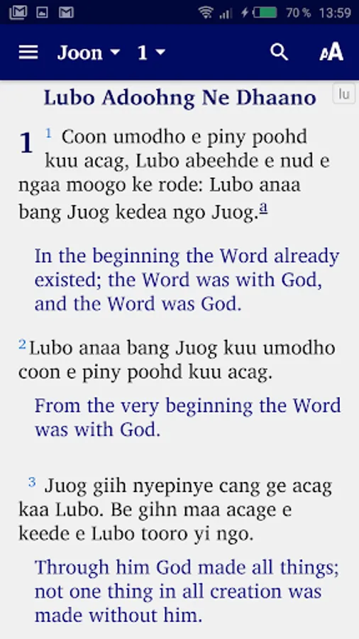 - "verse by verse" to display a verse in Luwo followed by the same verse in English.