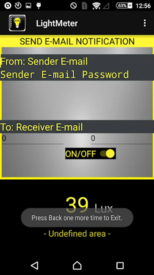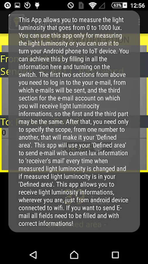 This App allows you to measure the light luminosity that goes from 0 to 1000 lux. You can use this app only for measuring the light luminosity or you can use it to turn your Android phone to IoT device. You can achieve this by filling in all the information here and turning on the switch. The first two sections from above you need to log in to the your e-mail, from which e-mails will be sent, and the third section for the e-mail account on which you will receive light luminocity informations, so the first and the third part may be the same. After that, you need only to specify the scope, from one number to another, that will make it your 'Defined area'. This app will use your 'Defined area' to send e-mail with current lux information to 'receiver's mail' every time when measured light luminocity is changed and if measured light luminocity is in your 'Defined area'. This app allows you to receive light luminosity informations, wherever you are, just from android device connected to wifi. If you want to send E-mail all fields need to be filled and with correct informations!