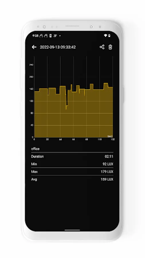 You can measure light intensity over long periods of time. The application automatically saves and statistics the measurement, allowing you to view and analyze the data later.
