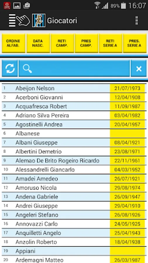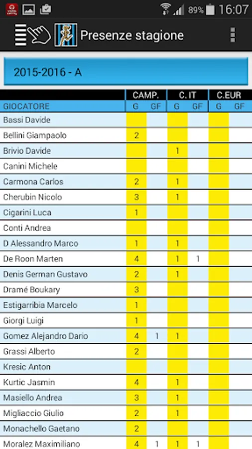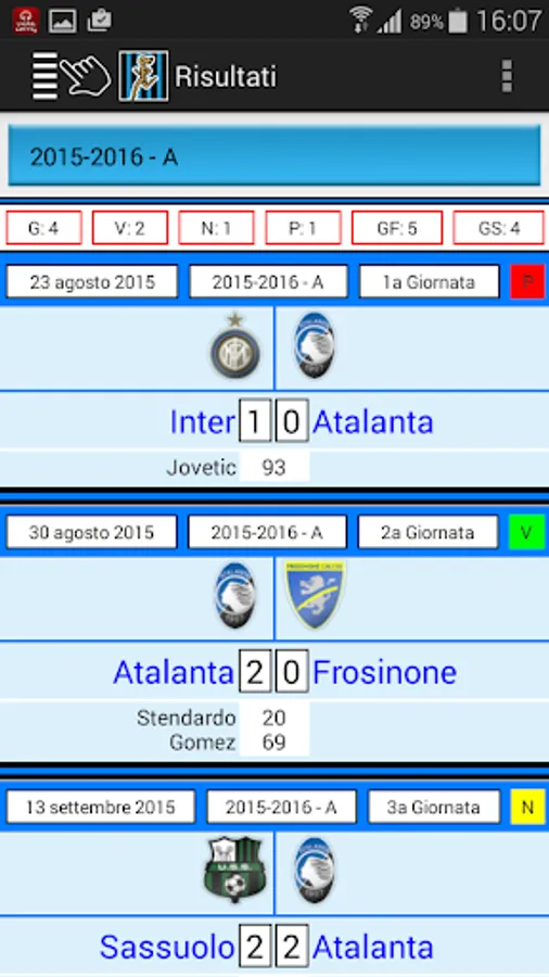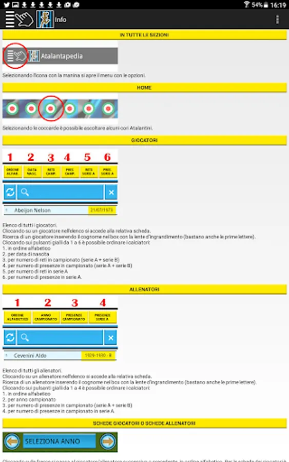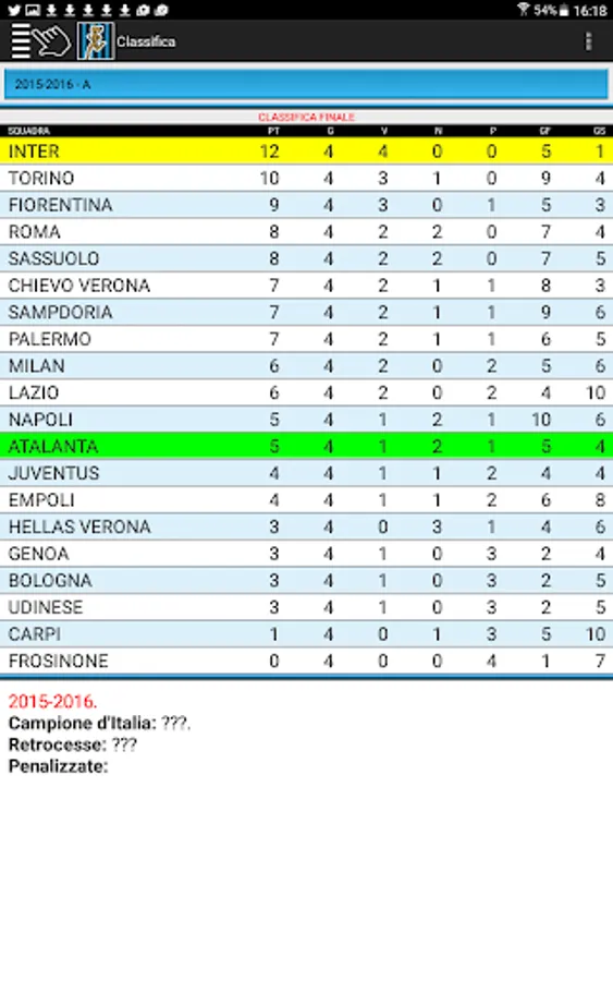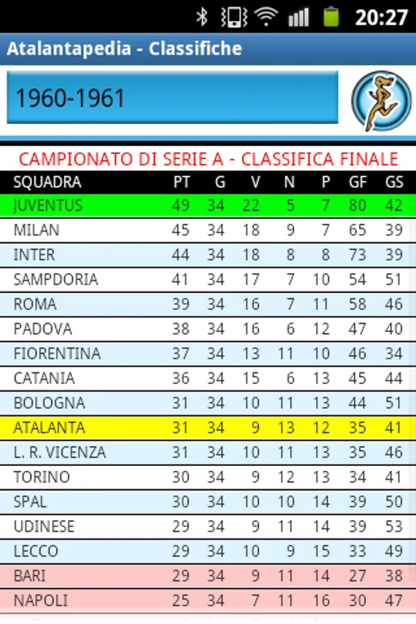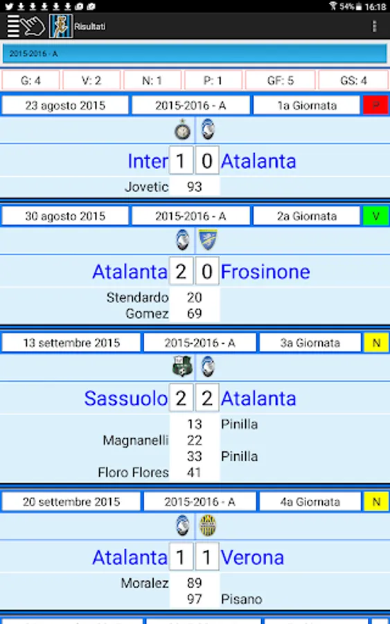 All the results and scorers of the matches of Atalanta in the league since 1930, in the Italian Cup and European tournaments. Card with biographical and statistical data of all players and coaches with at least one presence in the Nerazzurri shirt. Rankings for number of appearances or goals scored. Data 2016-2017 season updatable