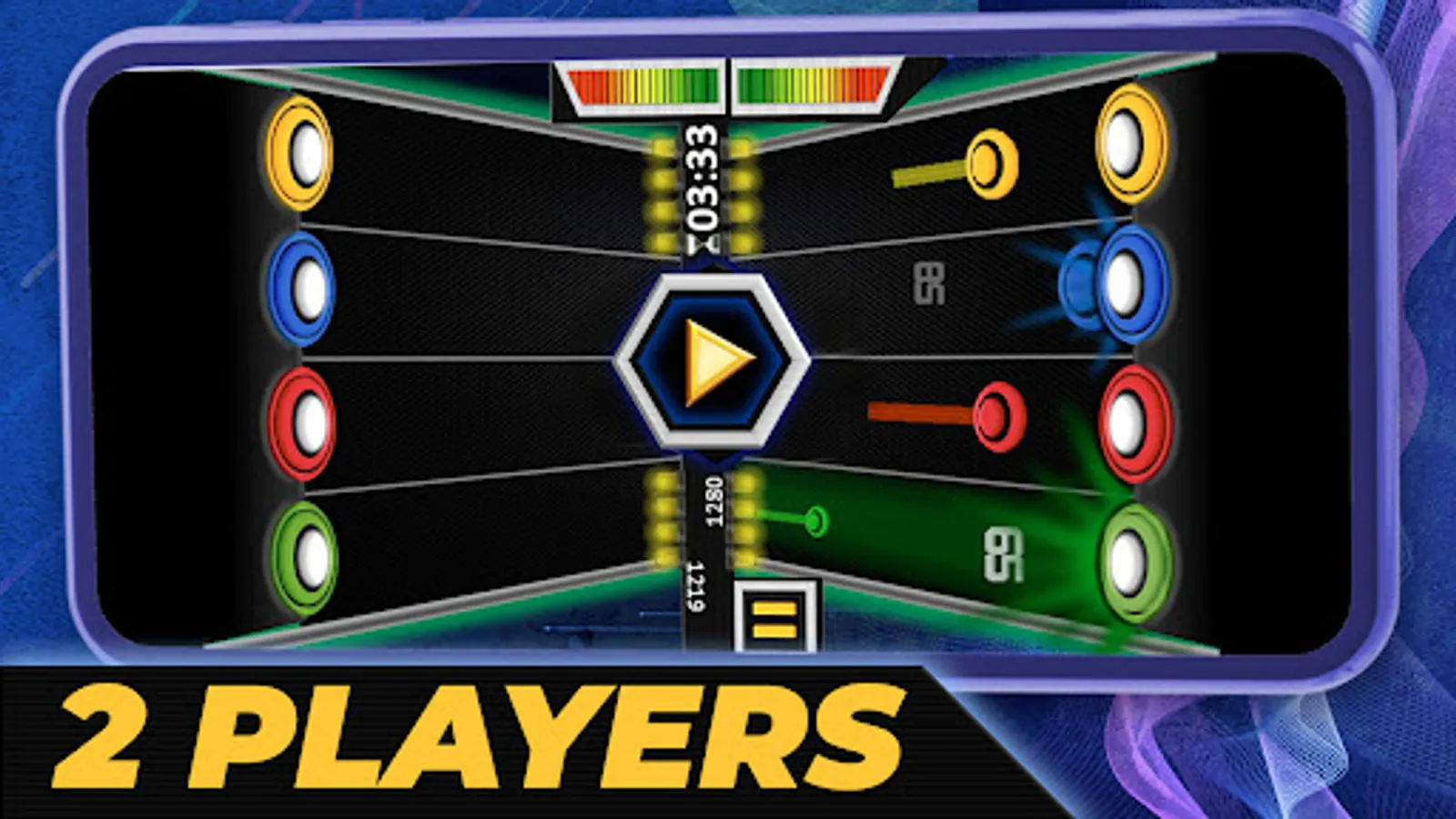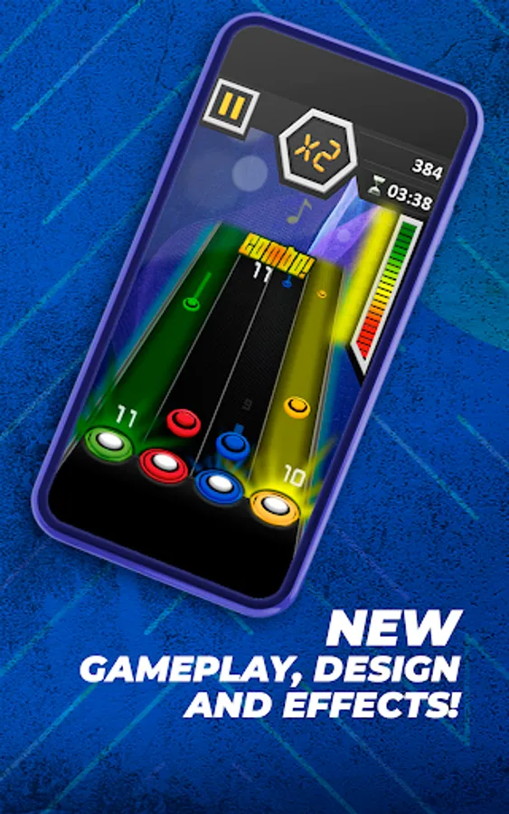Enjoy more than 100 real and remixed songs in this Guitar Hero-style music game!