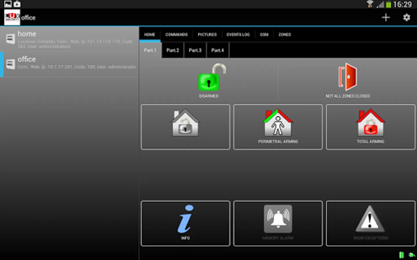Through this application, the user can control various functions of the alarm system according to the installed model panel. The application provides the control of up to four systems in WEB or SMS mode.
