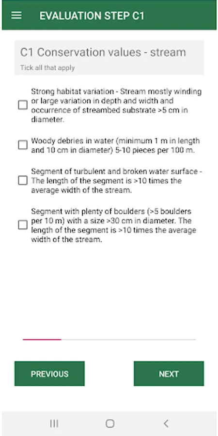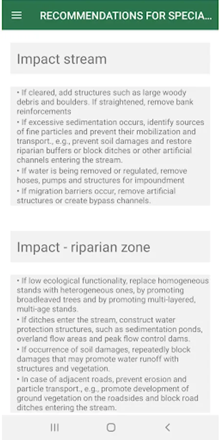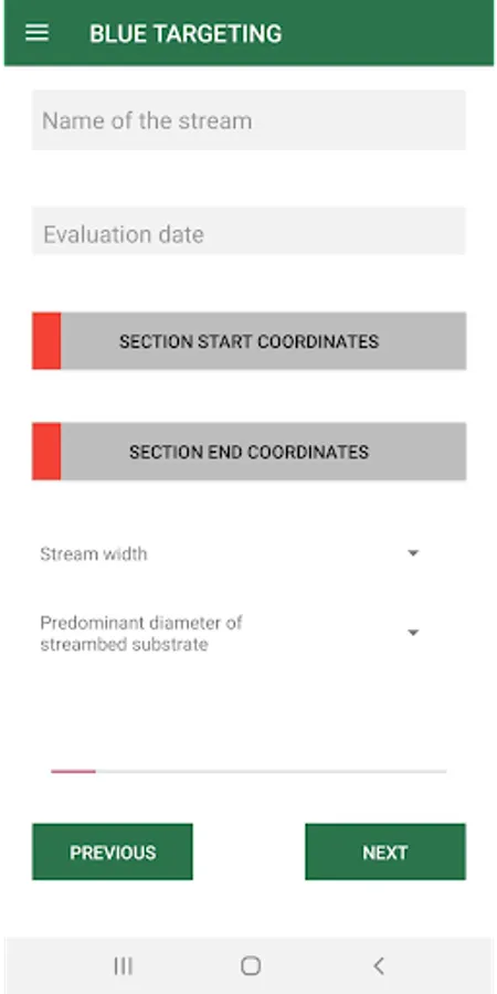 Information about the project Blue Targeting is a tool for best management practice for forestry along small streams. It is scientifically based and simplified to be used by non-professionals in practice. The main objective of the tool is to do: • the right measure • at the right place • to the right extent. The app works as a checklist for the inventory of stream sections. Data are collected for Conservation value (C), Impact (I), Sensitivity (S) and Added values (A). A new section is started when the stream or the riparian zone significantly changes, for example, when the water velocity changes from rapid to slow or the trees in the riparian zone are cut etc. This means that the sections will have different lengths. It is proposed to keep the sections no shorter than 100 metres. The Blue Targeting protocol is filled in after all the stretch has been walked through. Please, take the start and end coordinates of the stretch in the next page.
