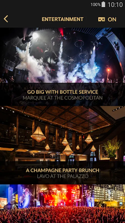 When you’re in Vegas, every second counts, but there’s a lot of ground to cover. Wouldn’t it be great to be the first to see it all? We’ve categorized the action for you so you can get right to the good stuff, all from your headset. You can walk around in a 360-degree world of luxury in high- roller villas and suites, zip line over Fremont Street, or experience bottle service in Marquee and much more. You can even peek inside the minds of contemporary artists like Adhemas Batista, Beeple, Fafi, Insa and Signalnoise, and see Vegas through their lenses. Witness the city get bolder, louder and brighter.