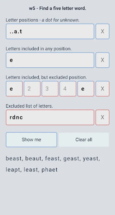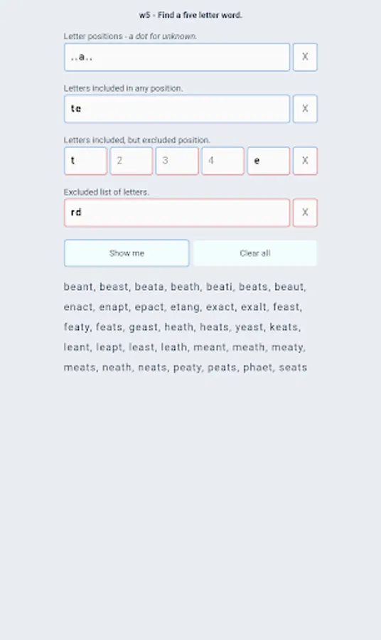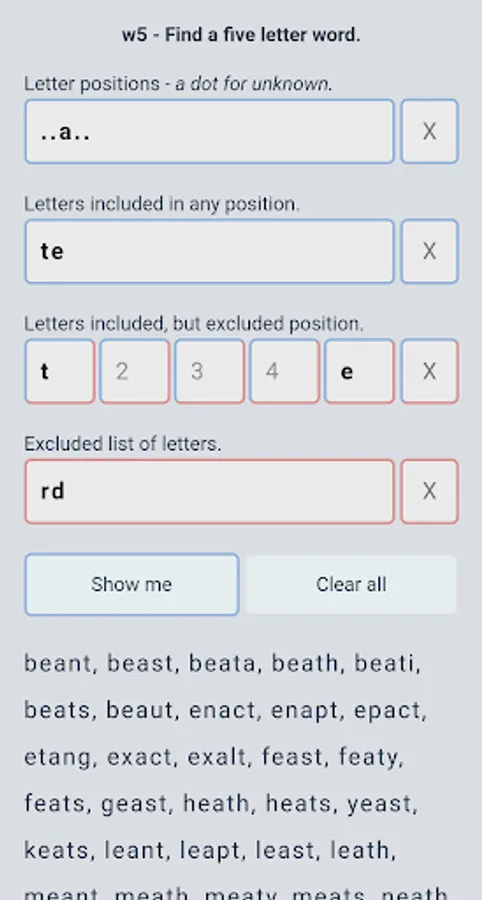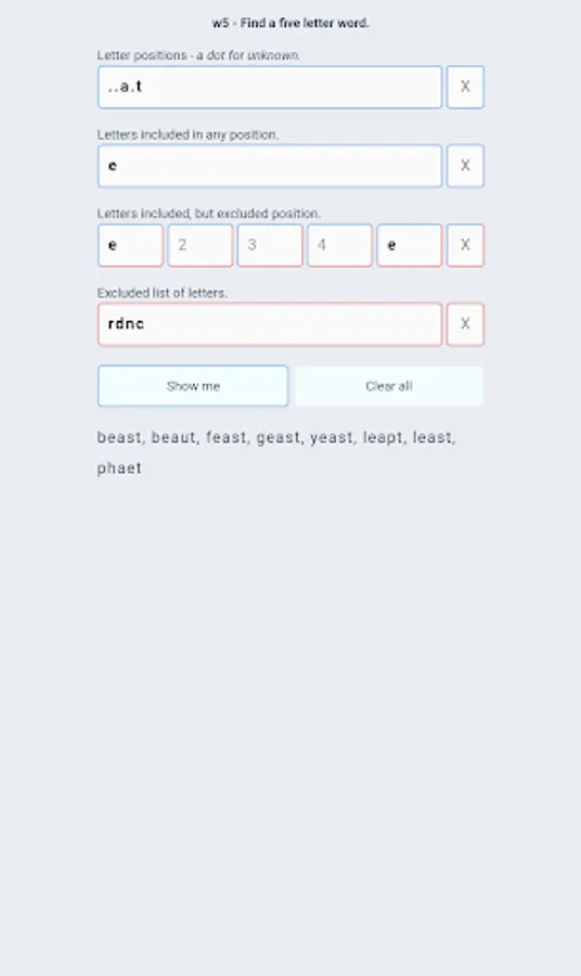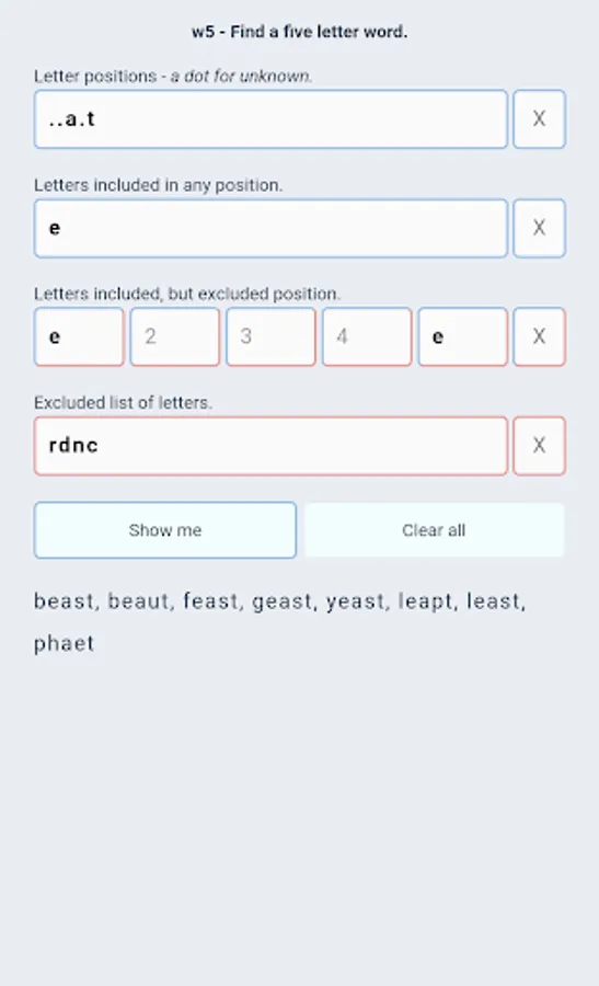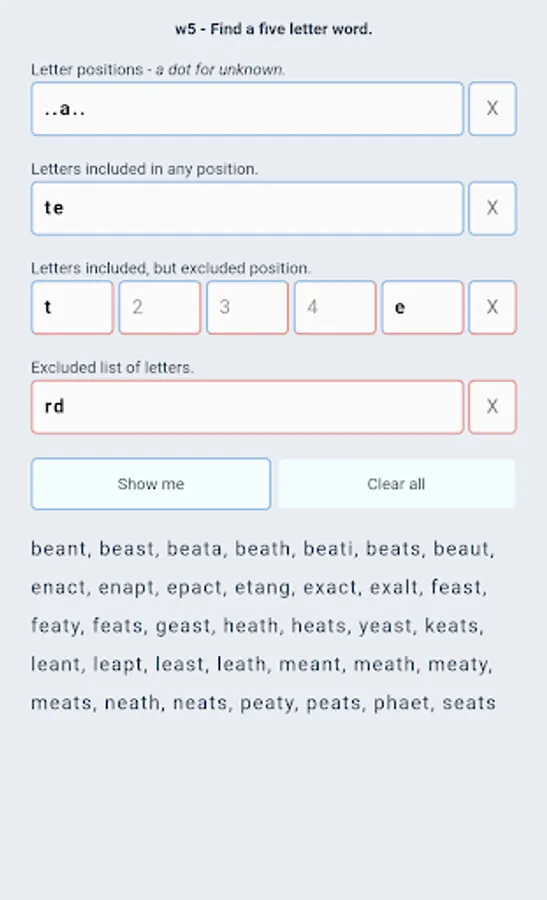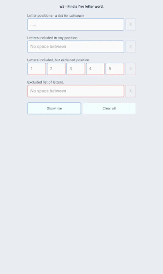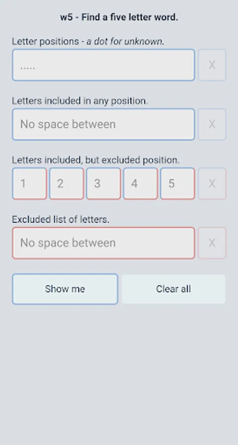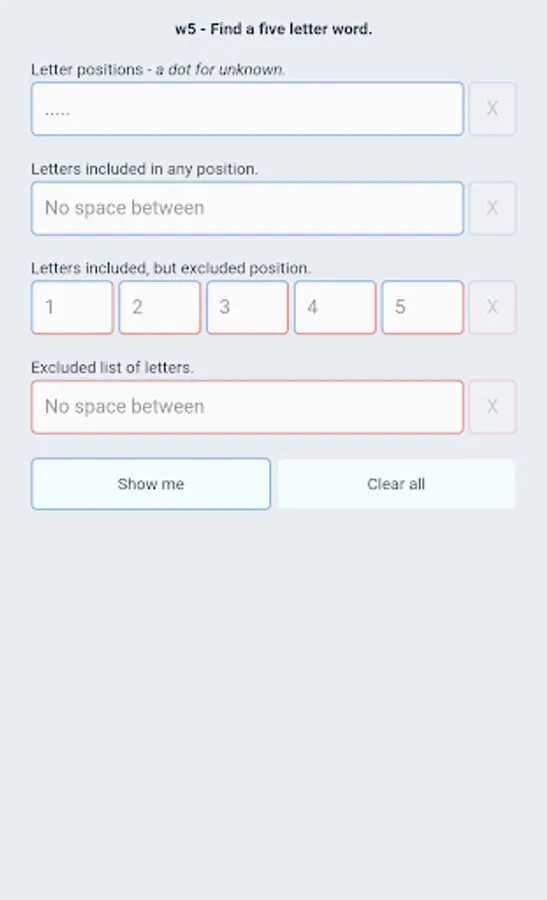 No ads, no payments or subscriptions - just a free app that does one thing: Find 5 letter words.
