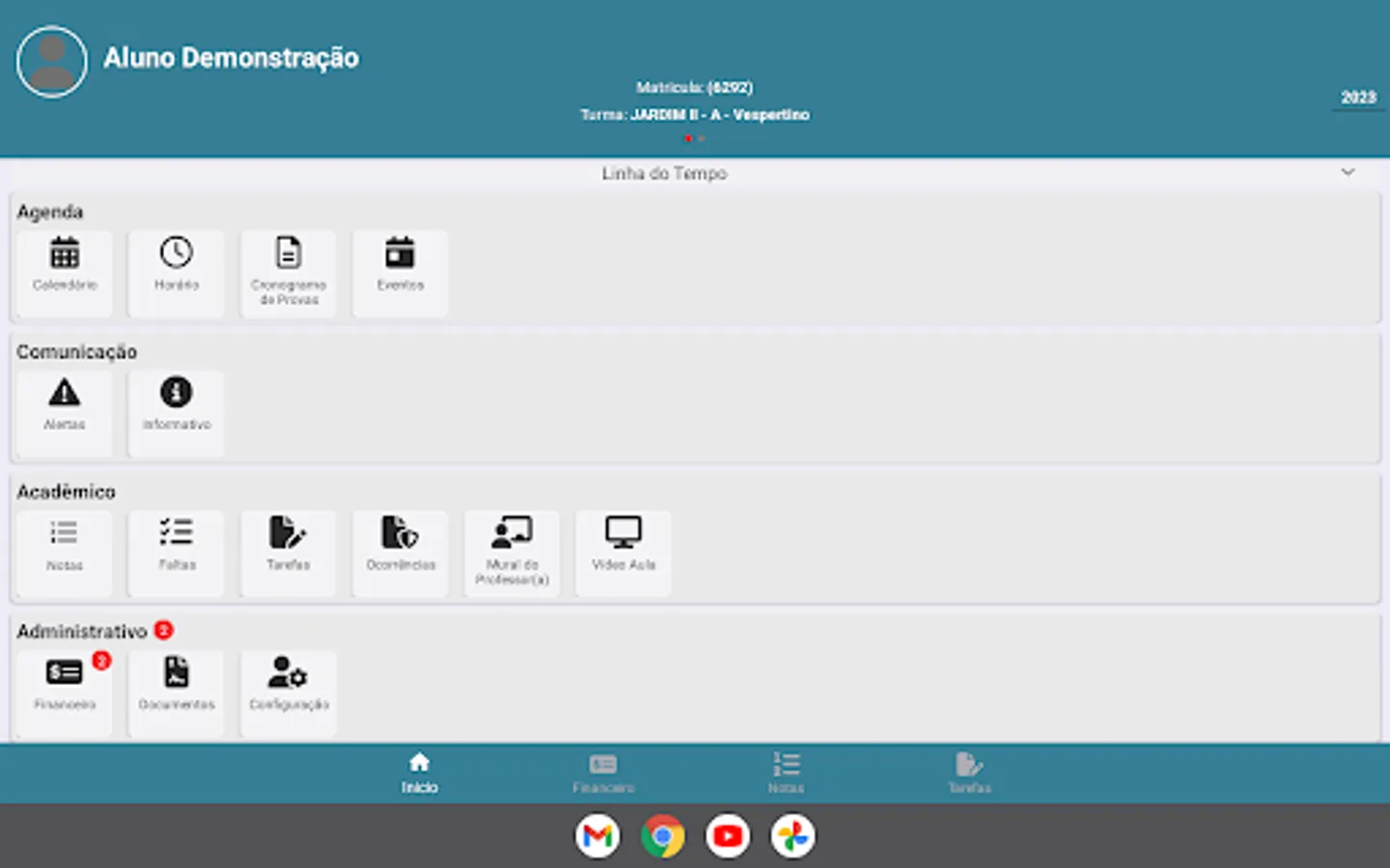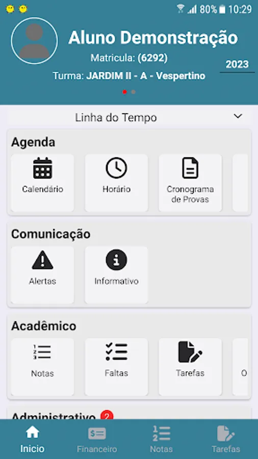 Announcements, News, Events, School Calendar, Finance with issue of Boletos, Notes, Frequency, Occurrences, Tasks, Contents, Exclusive area for Teacher publications, in addition to a Timeline that shows upcoming events are functions found in this application.