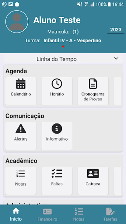 Announcements, News, Events, School Calendar, Finance with issue of Boletos, Notes, Frequency, Occurrences, Tasks, Contents, Exclusive area for Teacher publications, in addition to a Timeline that shows upcoming events are functions found in this application.